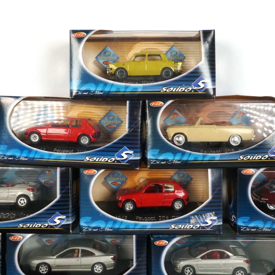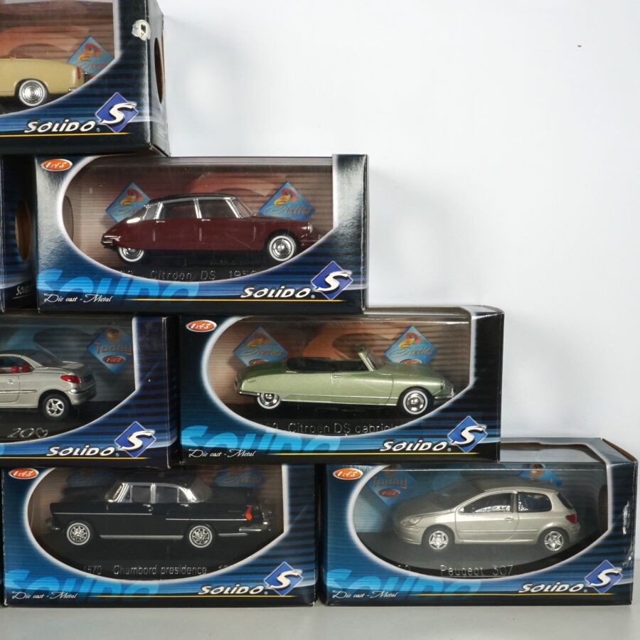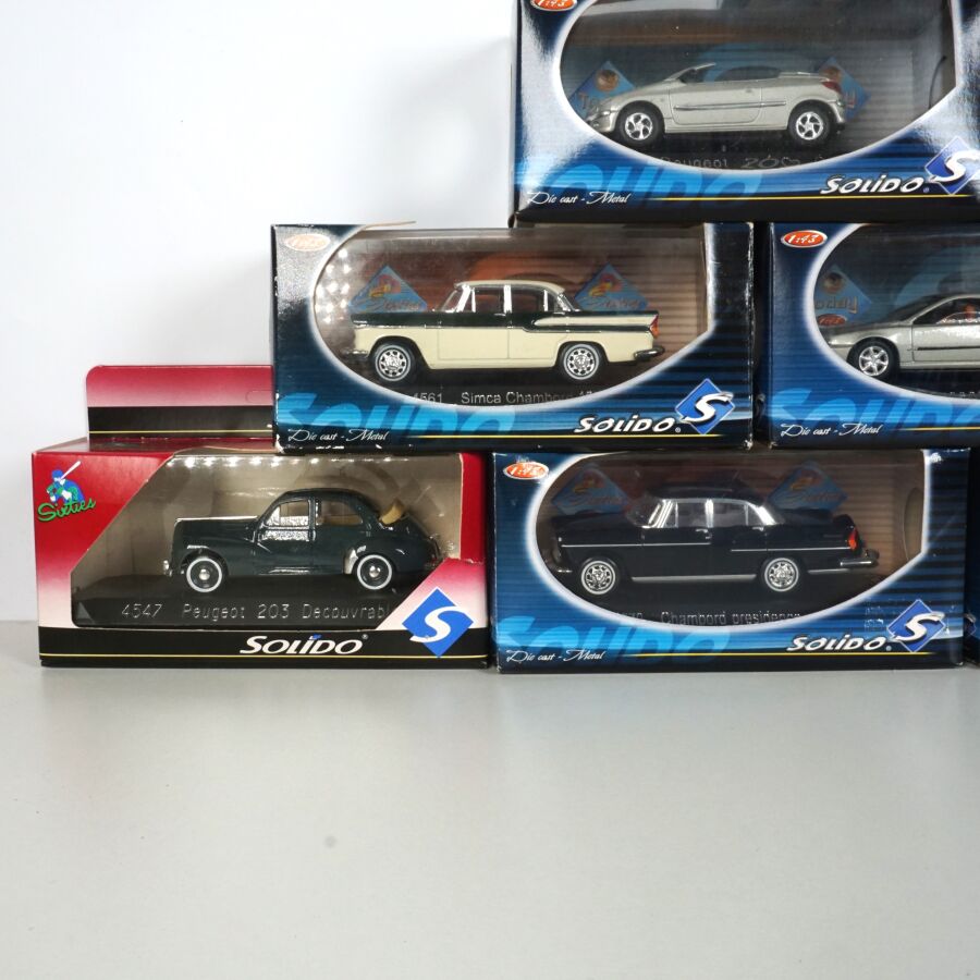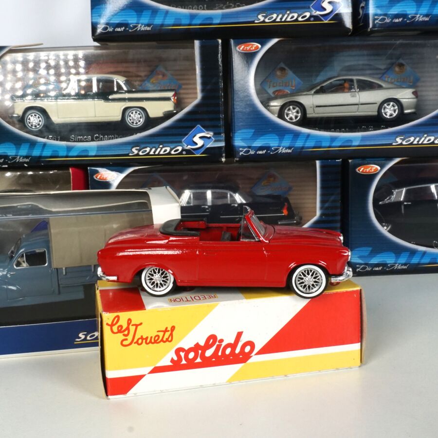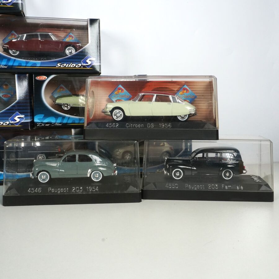 SOLIDO : Ensemble de 19 véhicules, échelle 1/43ème, comprenant notamment (1) Peugeot 203 Pick-Up 1952, réf. S4303400, bleu-gris ; (1) Peugeot 203 Familiale, réf. 4550, noire ; (1) Citroën DS "Officielle", réf. 4566, noire ; (1) Peugeot 203 Découvrable, réf. 4547, grise ; (1) Chambord présidence 1958, réf. 4570, noire ; (1) Simca 1000 Rallye 2, réf. 1845, jaune et noire ; et divers, présentés en boîte d'origine .