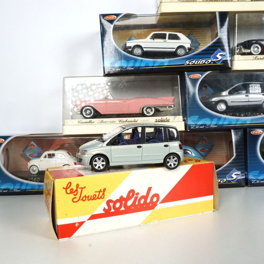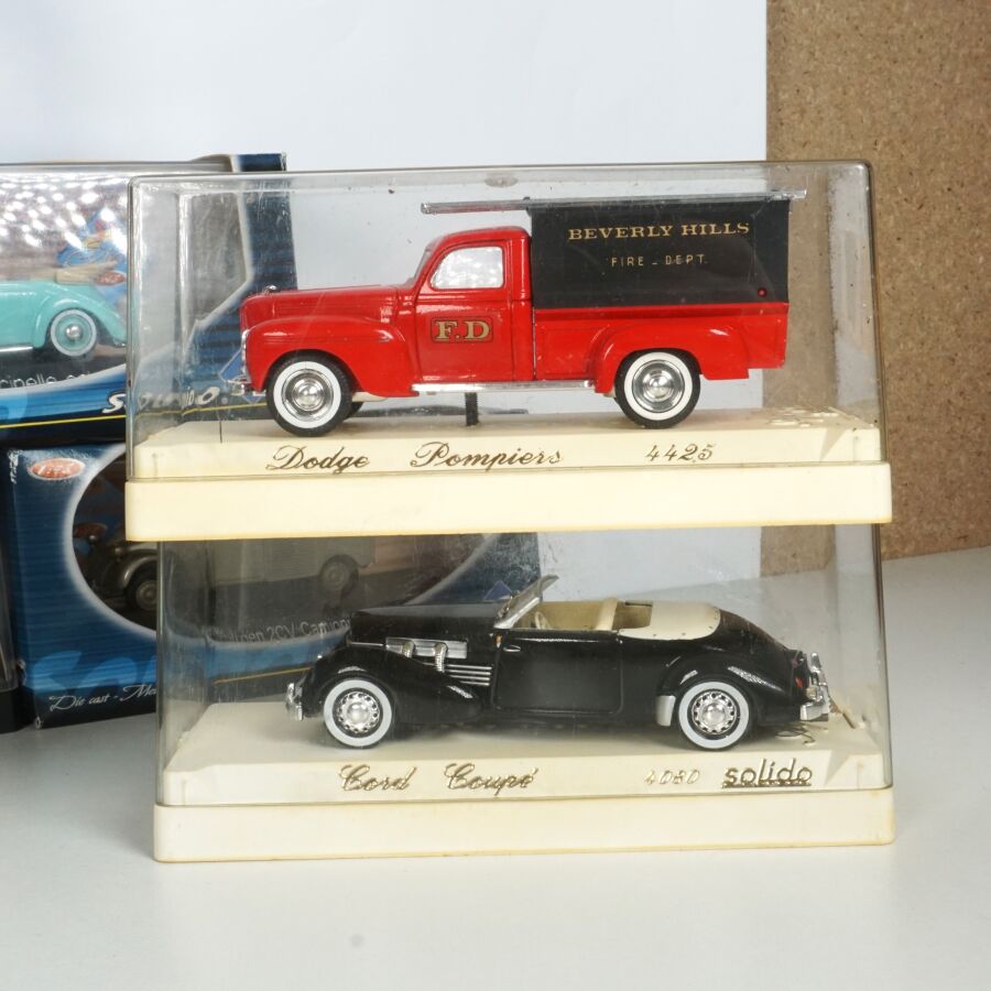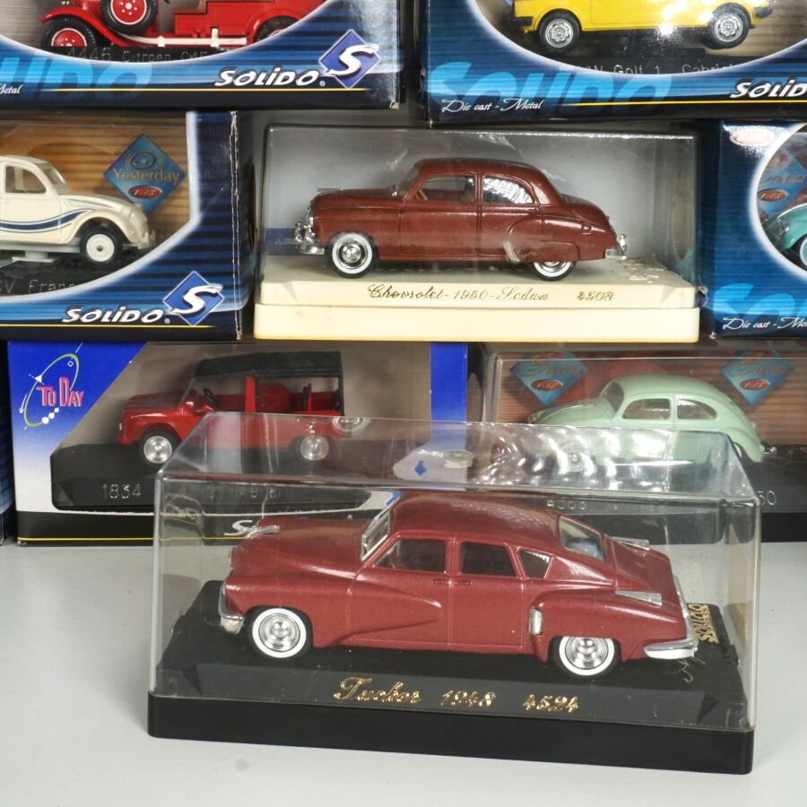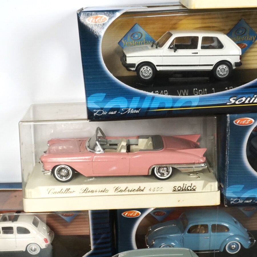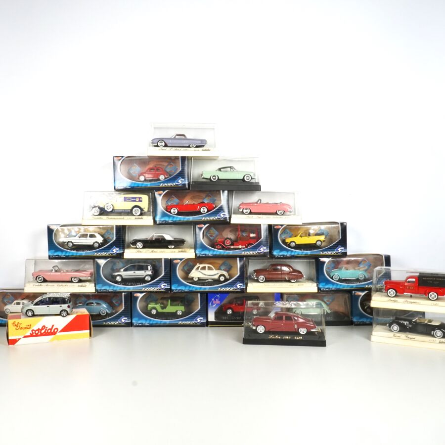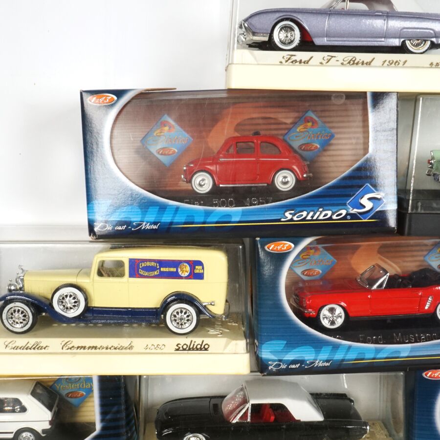 SOLIDO : Ensemble de 23 véhicules dont certains collection "L'âge d'or" et "To Day", échelle 1/43ème, comprenant notamment (1) Cadillac commerciale "Cadbury's Cocoa Essence", réf. 4060, crème ; (1) Fiat 500 1957, réf. 4560, blanche ; (1) Buick Super 1950 Cabriolet, réf. 4511, rose ; (1) VW Coccinelle 1950, réf. 4559, vert clair ; (1) Tucker 1948, réf. 4524, bordeaux ; (1) Dodge Pompiers, réf. 4425, rouge ; et divers, présentés en boîte d'origine .