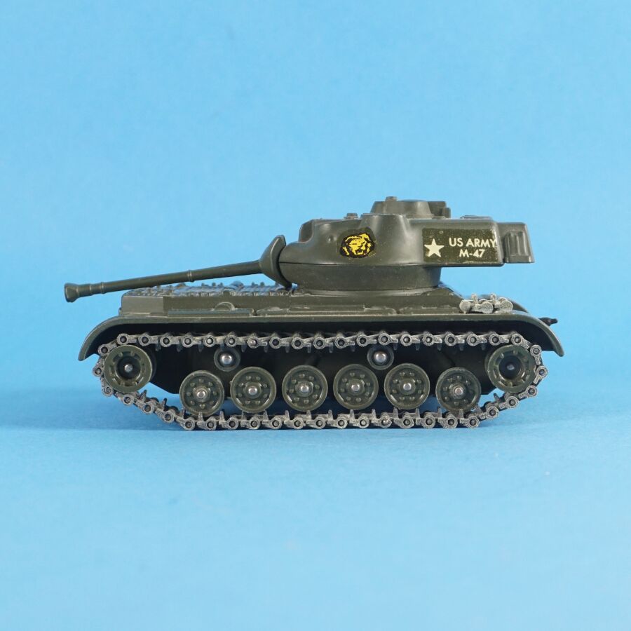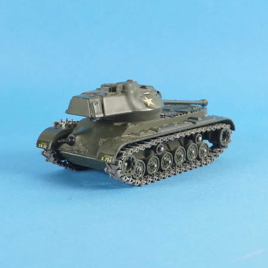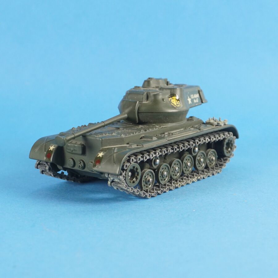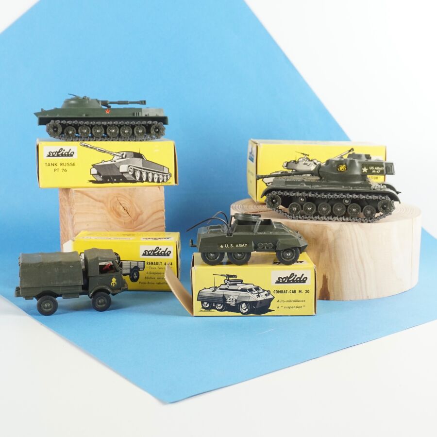 SOLIDO : Ensemble de 4 véhicules militaires, échelle 1/43ème, comprenant : (1) Tank russe PT 76, réf. 207 ; (1) Renault 4x4 tous terrains, avec bâches amovibles et pare-brise rabattable, réf. 203 ; (1) Tank "Patton" M-47 et (1) Combat-car M. 20 auto-mitrailleuse, dans leurs boîtes d'origine (en l'état, déchirures, usures, manques des languettes, quelques traces et usures aux véhicules).