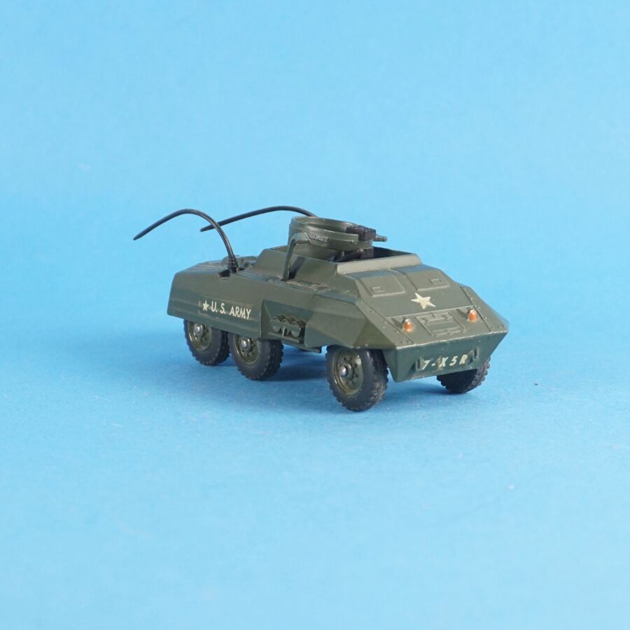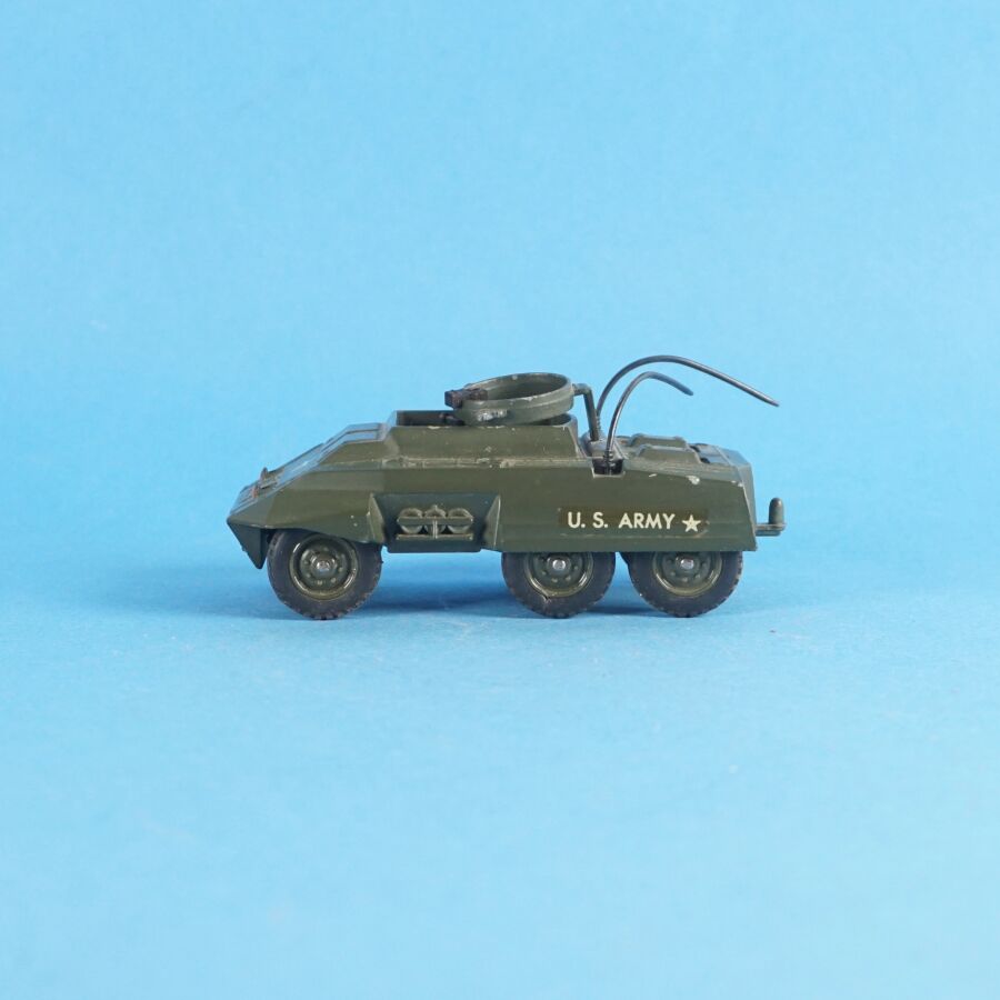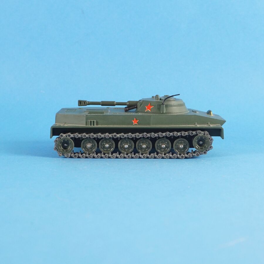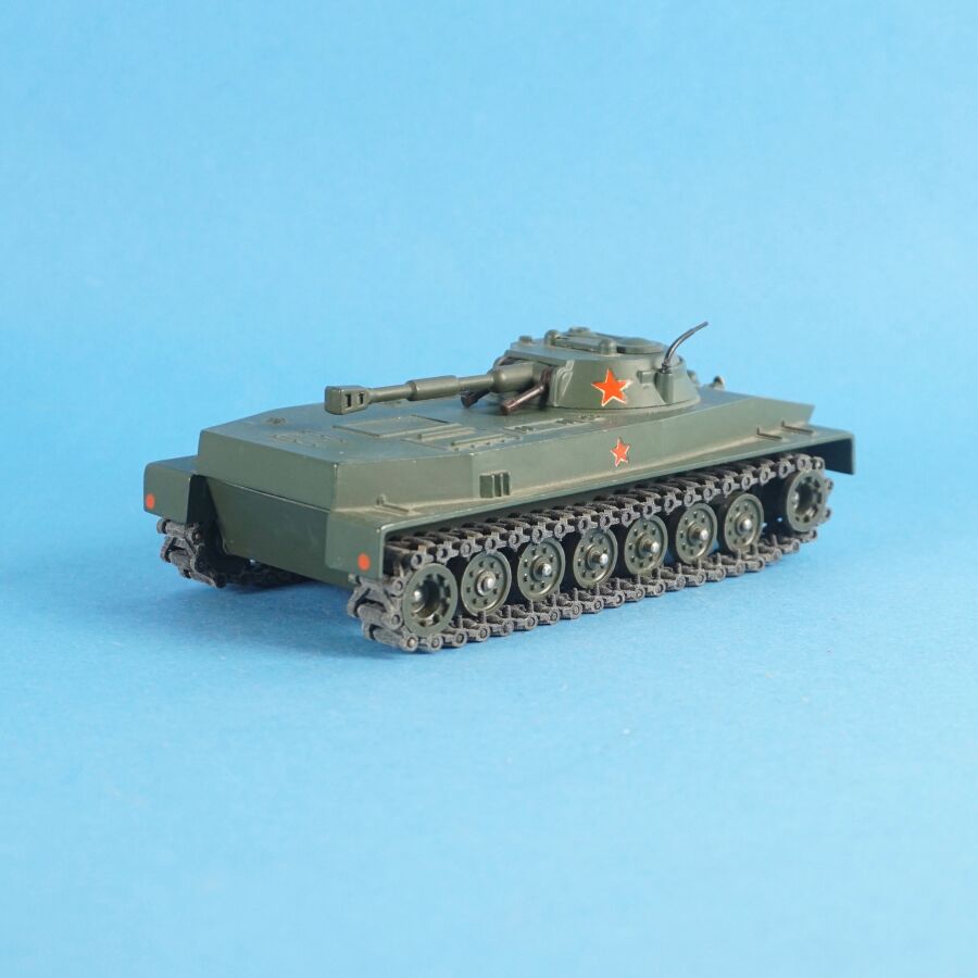 SOLIDO : Ensemble de 4 véhicules militaires, échelle 1/43ème, comprenant : (1) Tank russe PT 76, réf. 207 ; (1) Renault 4x4 tous terrains, avec bâches amovibles et pare-brise rabattable, réf. 203 ; (1) Tank "Patton" M-47 et (1) Combat-car M. 20 auto-mitrailleuse, dans leurs boîtes d'origine (en l'état, déchirures, usures, manques des languettes, quelques traces et usures aux véhicules).