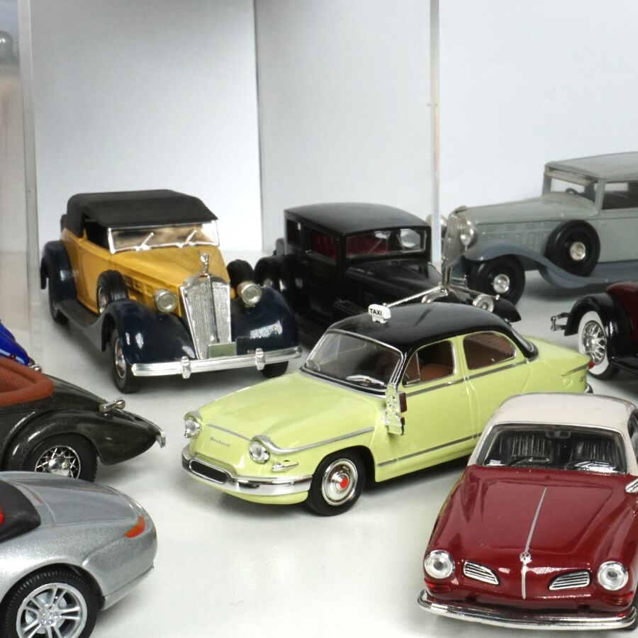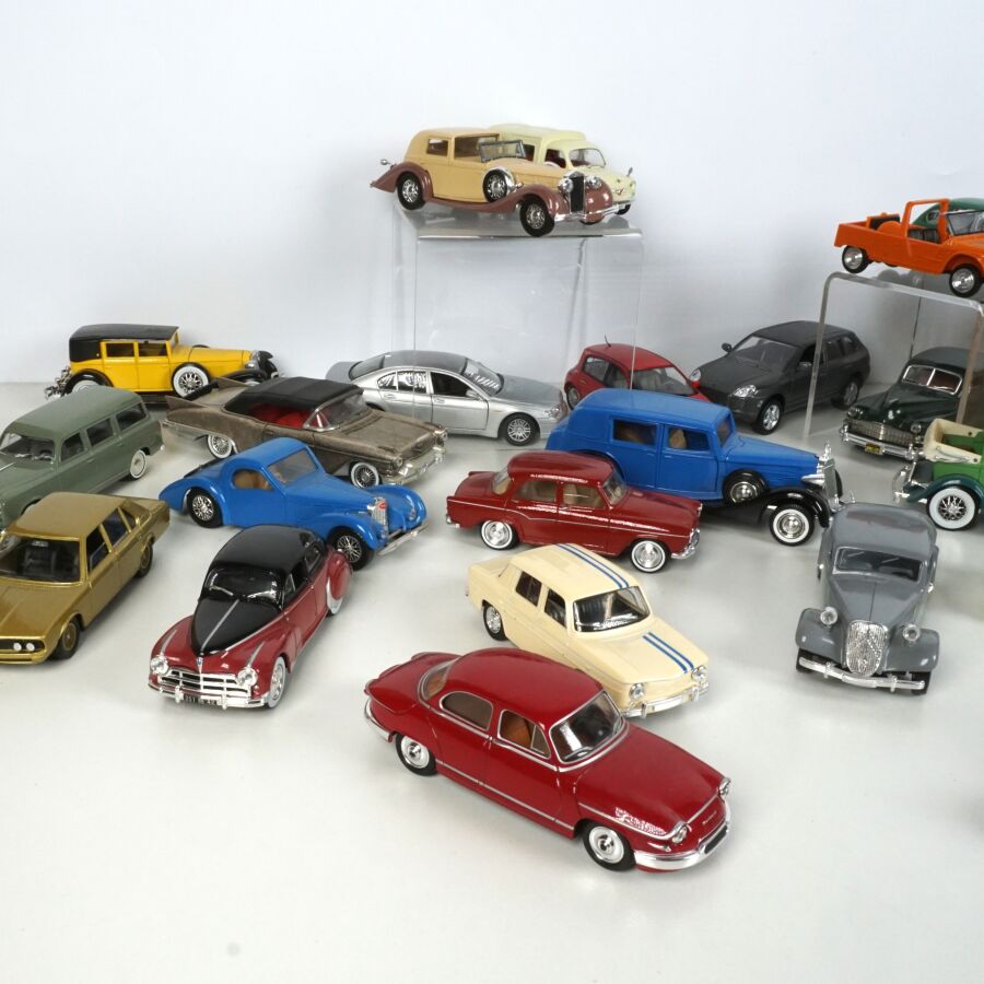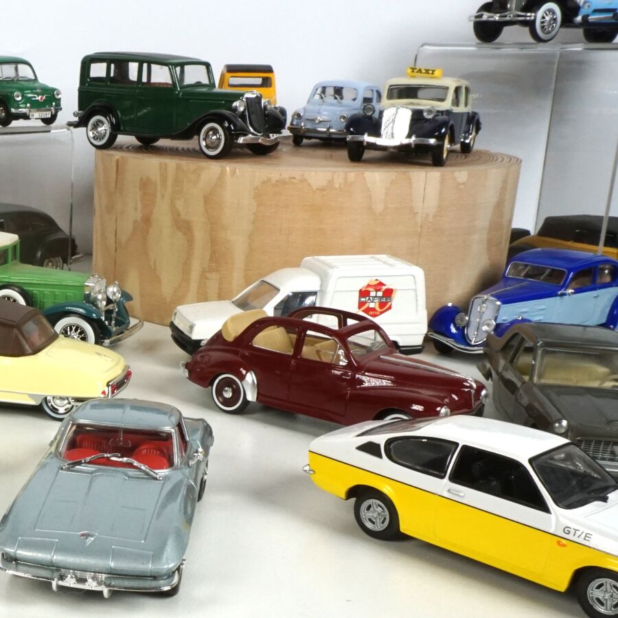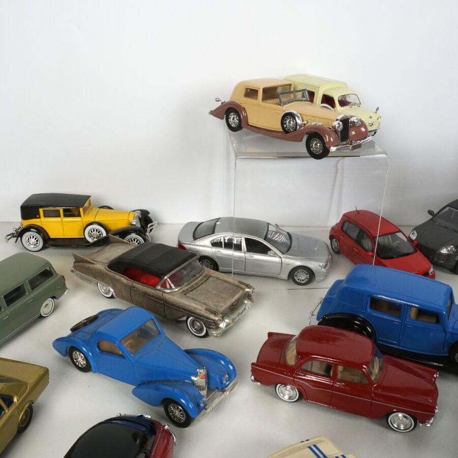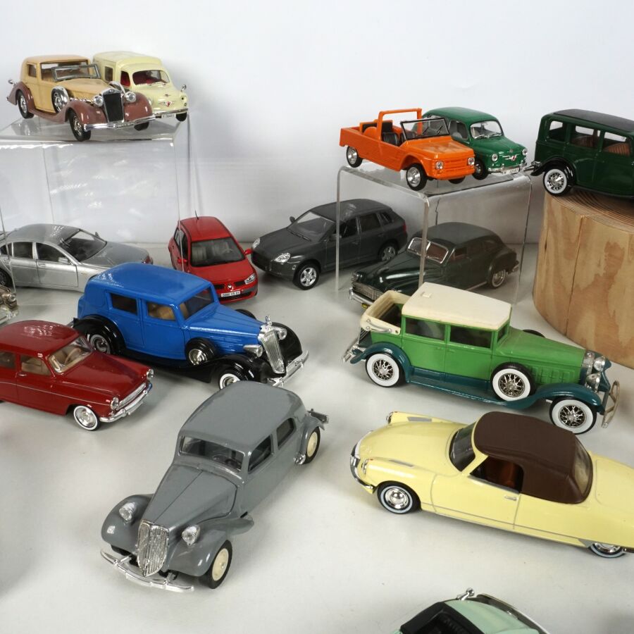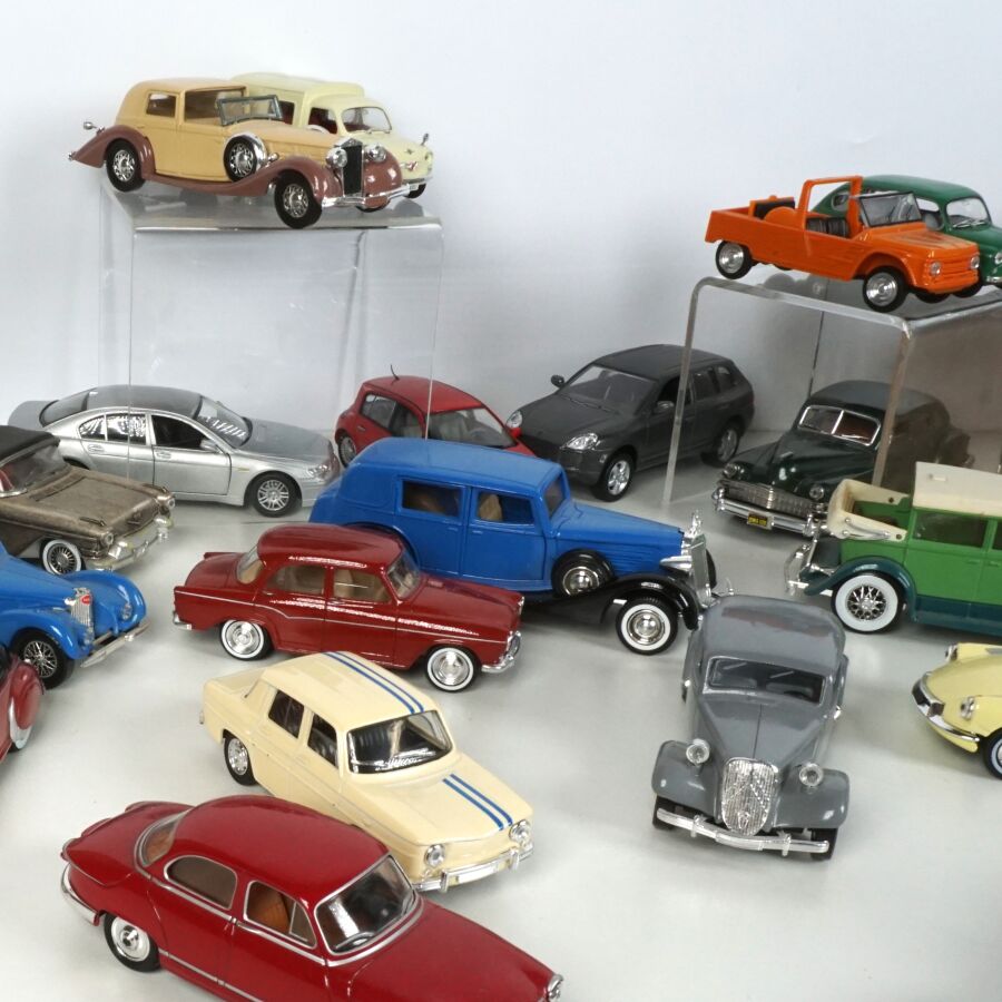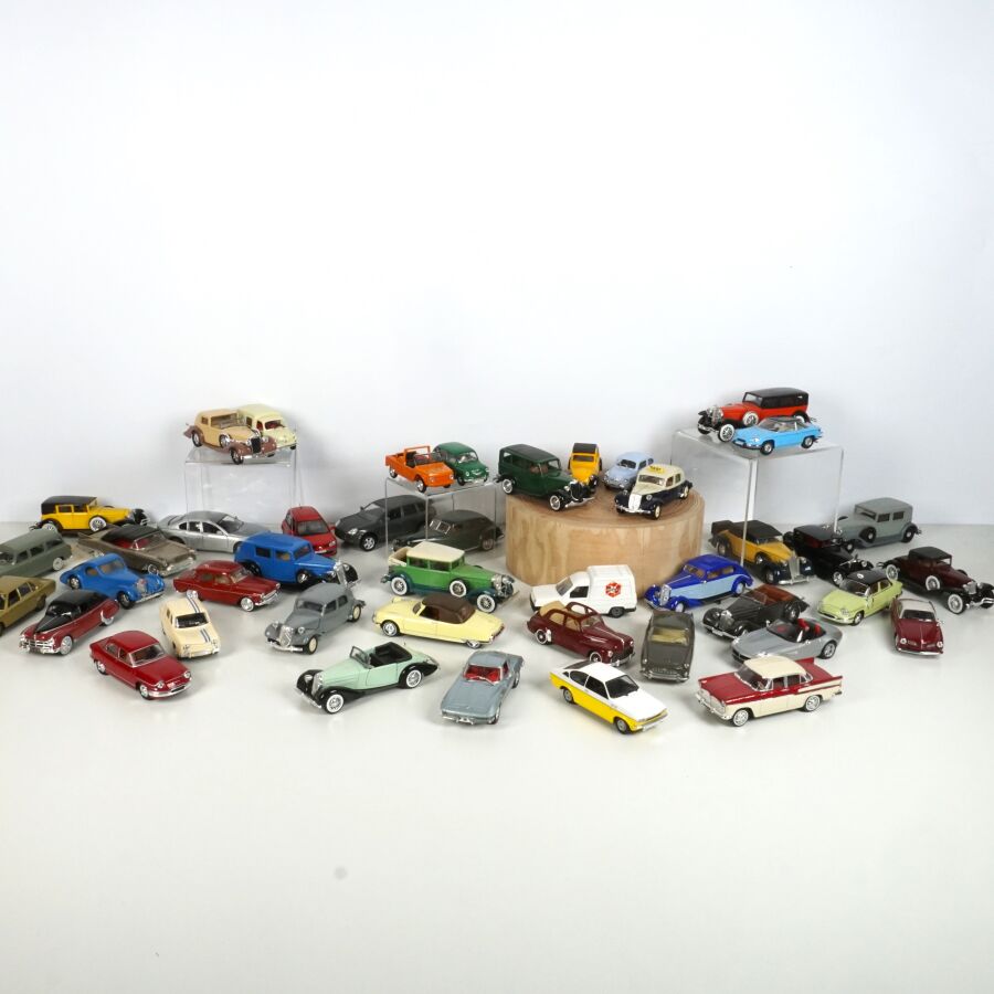SOLIDO : Ensemble de 43 véhicules, échelle 1/43ème, comprenant notamment (1) Porsche Cayenne Turbo 2002, grise ; (1) Panhard PL17, 1961, rouge liseré blanc ; (1) Taxi Citroën 15 SIX, 1939, bleue et beige ; (1) Seat 800, 1964, verte ; (1) Ford V8, 1936, verte et noire ; (1) Citroën Méhari, orange ; et divers (usures, écaillures).