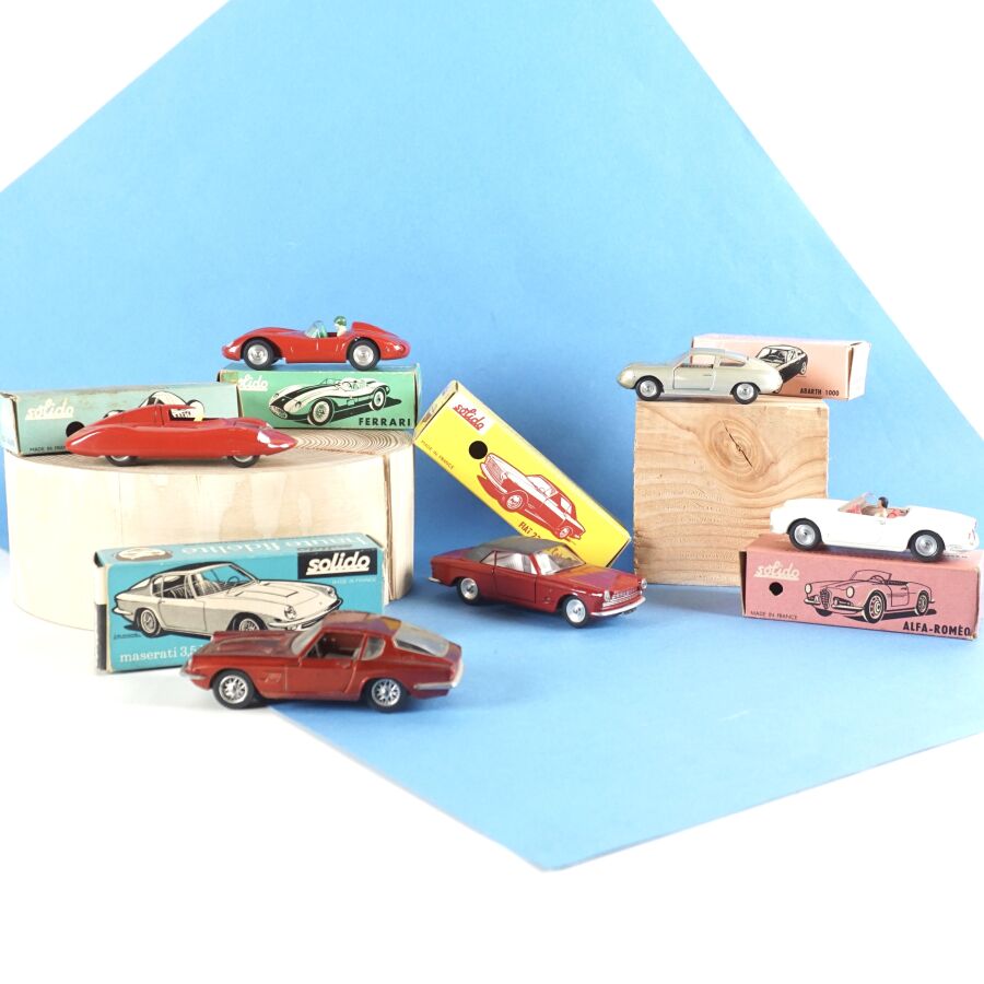 SOLIDO : Ensemble de 6 véhicules, échelle 1/43ème, comprenant : (1) Maserati 3.51, bordeaux, réf. 139 ; (1) Fiat 2300 S cabriolet GHIA rouge, toit gris, réf. 133 ; (1) Fiat Abarth, rouge; (1) Alfa-Roméo Giulietta Spider, blanche, intérieur rouge, avec conductrice ; (1) Fiat Abarth 1000, grise, portes ouvrantes et (1) Ferrari type 500 T.R.C, rouge, n°2, avec conducteur, dans leurs boîtes d'origine (en l'état, déchirures pour certaines, quelques traces et légères écaillures à la peinture).