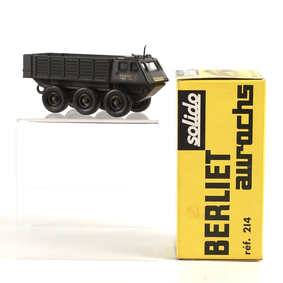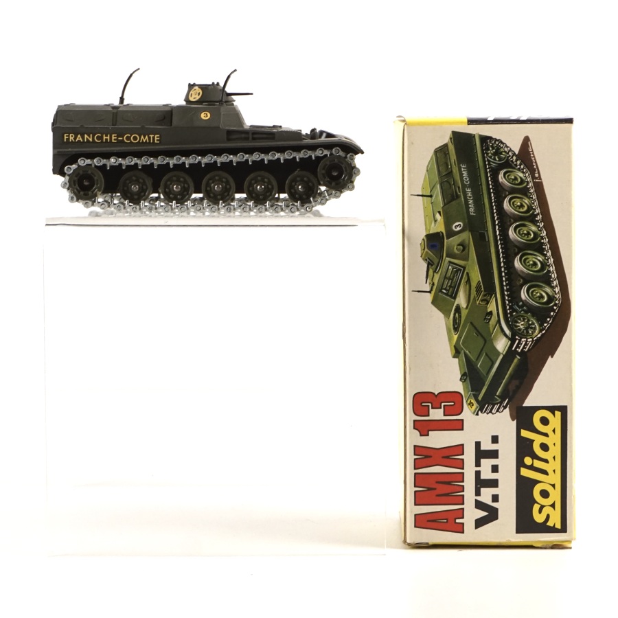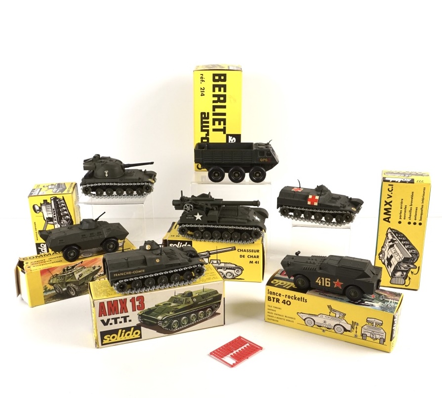 SOLIDO : Ensemble de 7 véhicules militaires miniatures comprenant : Chasseur de Char M41, réf. 219 ; AMX V.C.I, réf. 227 ; Véhicule blindé amphibie "Commando", réf. 224 ; AMX 13 Bitube anti-aérien, réf. 223 ; Berliet "Aurochs", réf. 214 ; BTR 40 Lance-rocketts russe, réf. 225 ; AMX 13 V.T.T, réf. 227 bis ; avec leur boîte d'origine (déchirures et usures des boîtes).