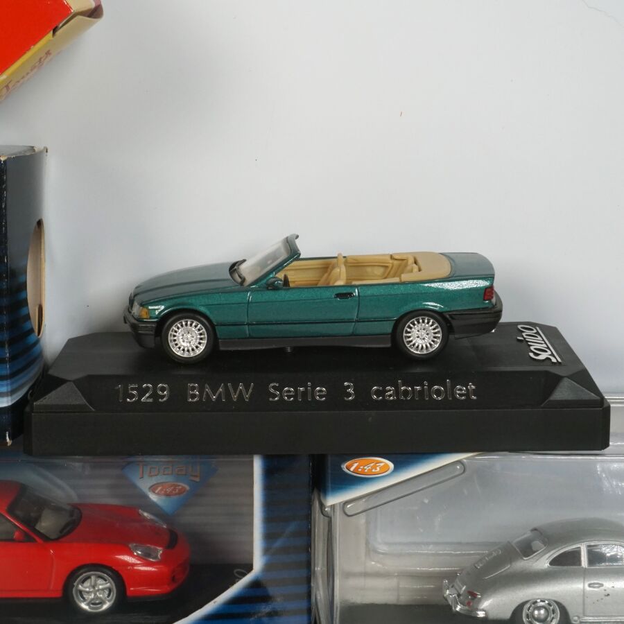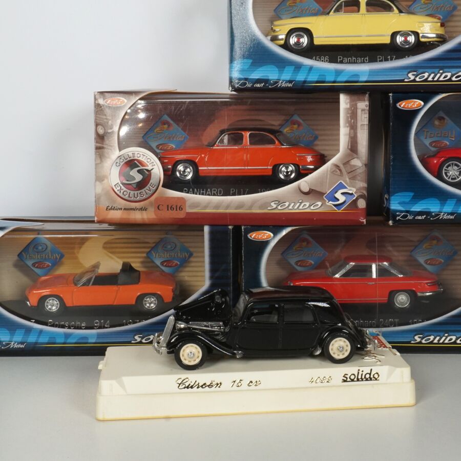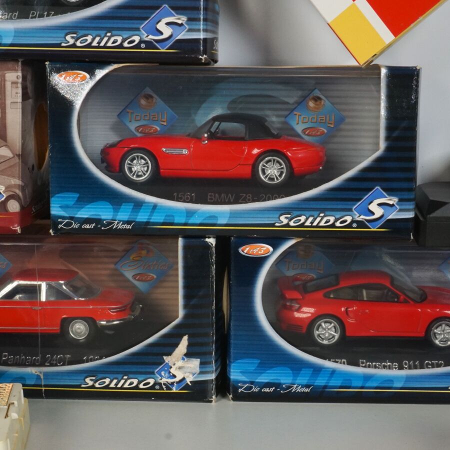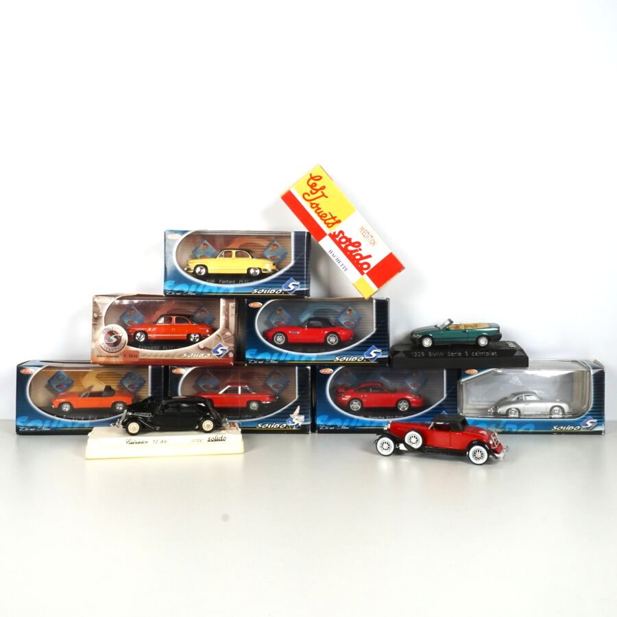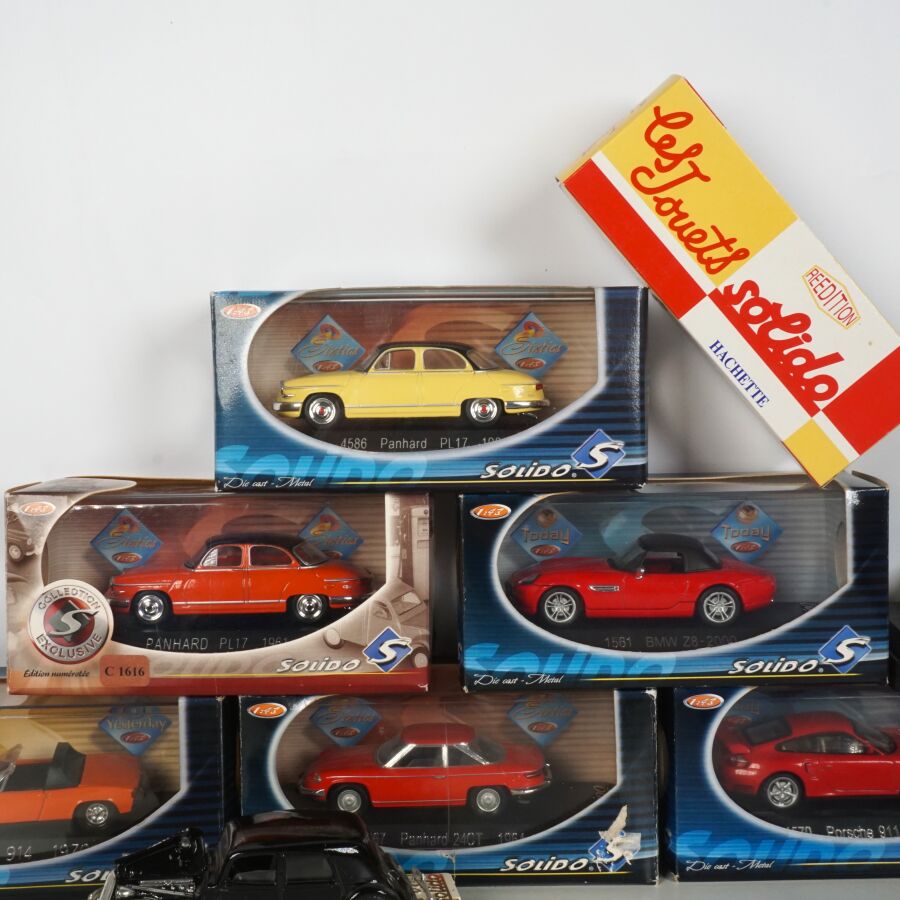 SOLIDO : Ensemble de 9 véhicules, échelle 1/43ème, comprenant (1) Panhard PL17, 1961, orange toit noir ; (1) Panhard 24CT, 1964, réf. 4567, rouge ; (1) BMW Z8-2000, réf. 1561, rouge toit noir ; (1) Porsche 911 GT2, 2001, réf. 1570, rouge ; (1) Porsche 356A, 1959, argent ; (1) Panhard PL17, 1961, réf. 4586, jaune ; (1) Porsche 914, 1970, réf. 1823, orange ; (1) Citroën 15cv, réf. 4032, noire et (1) BMW Série 3 cabriolet, réf. 1529, verte, présentés sur socle, 7 en boîte d'origine.