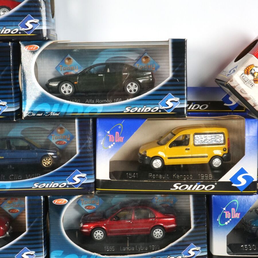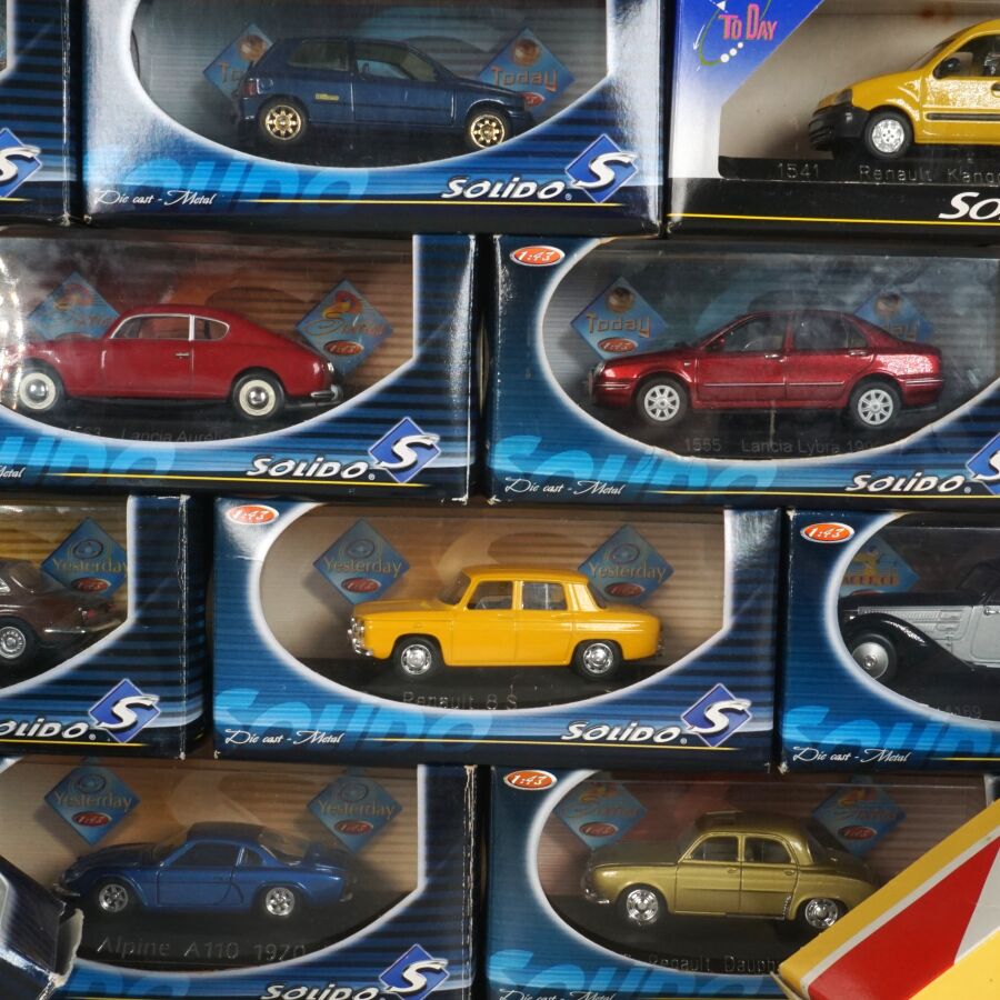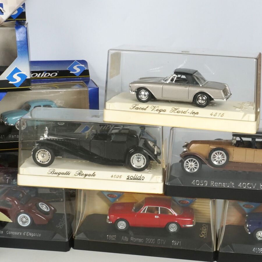 SOLIDO : Ensemble d'environ 32 véhicules dont certains collection "L'âge d'or" et "To Day", échelle 1/43ème, comprenant notamment (1) Alpine A110, 1970, réf. 1803, bleue ; (1) Renault 4cv découvrable, réf. 4538, bordeaux ; (1) Renault 40CV Berline, réf. 4059, marron/doré ; (1) Alfa Roméo Guilietta Sprint, 1960, réf. 4588, bleue ; (1) Alfa Roméo 2600 Sprint, réf. 125, rouge (en coffret) ; (1) Bugatti Atalante, concours d'élégance, réf. 4147, bordeaux et beige ; et divers, présentés en boîte d'origine .