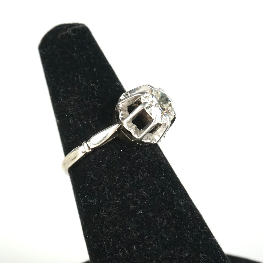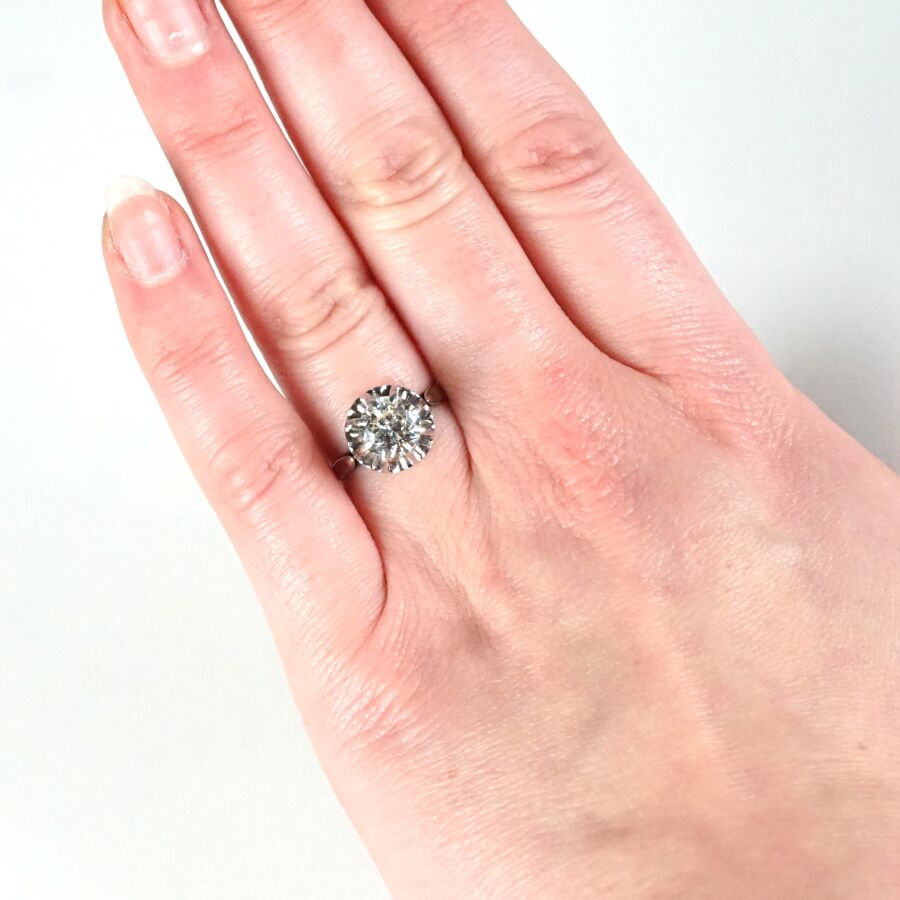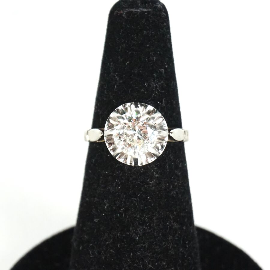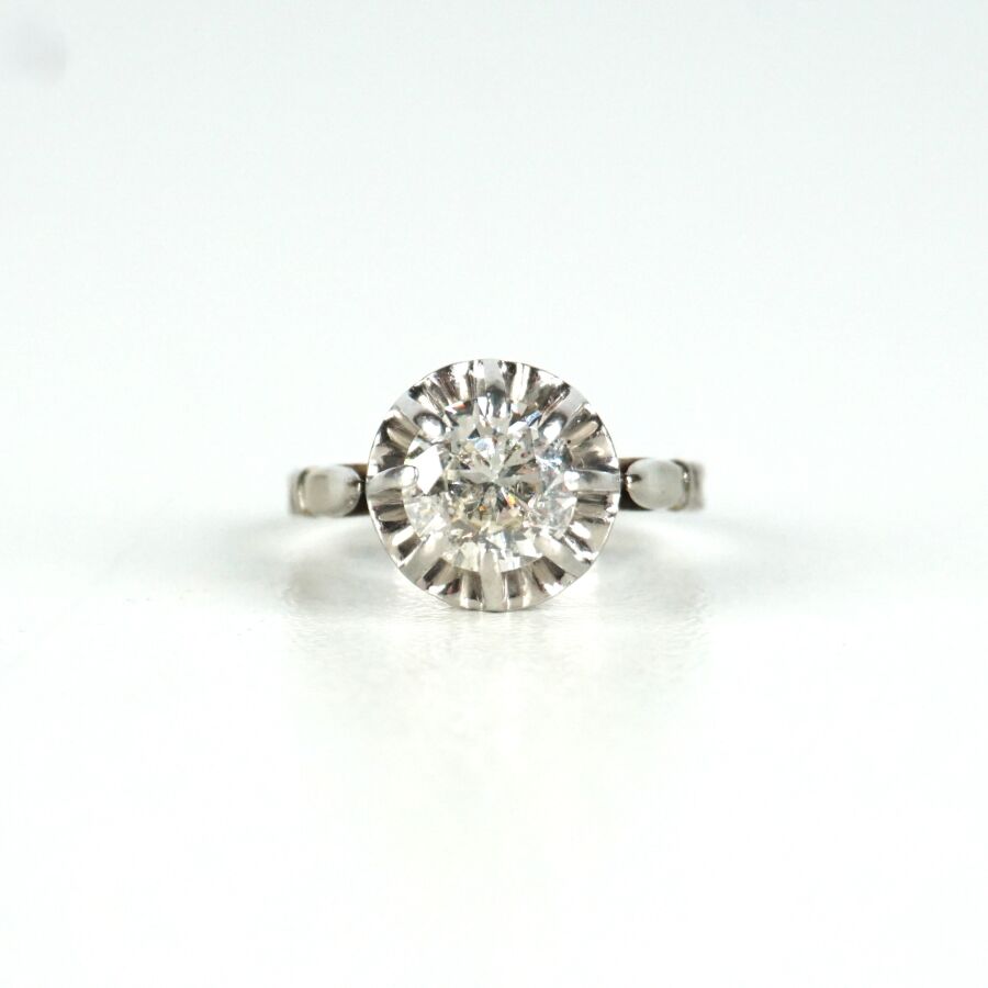 Solitaire, monture en or gris 18K (750/oo) et platine (850/oo), serti 8 griffes d'un diamant taille brillant calibrant 1.6 cts environ (D. 7.5 mm), couleur supposée J/K, TDD. 52. Poids brut : 4,2 g environ (petites inclusions légères peu visibles à l'oeil nu).
