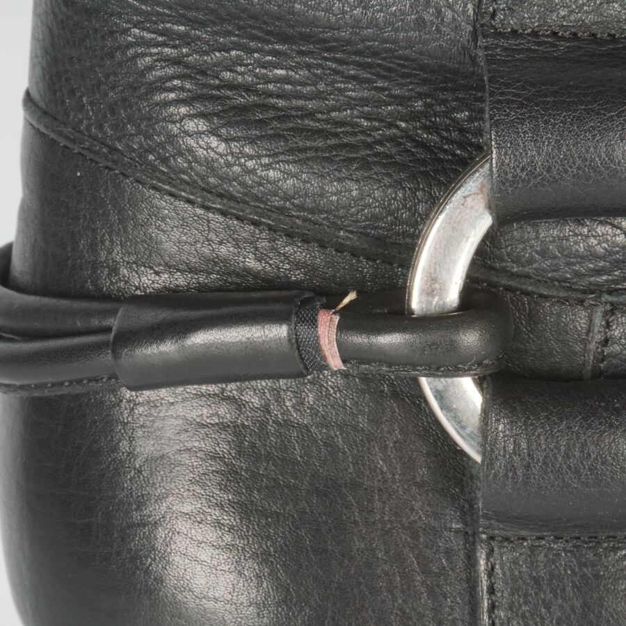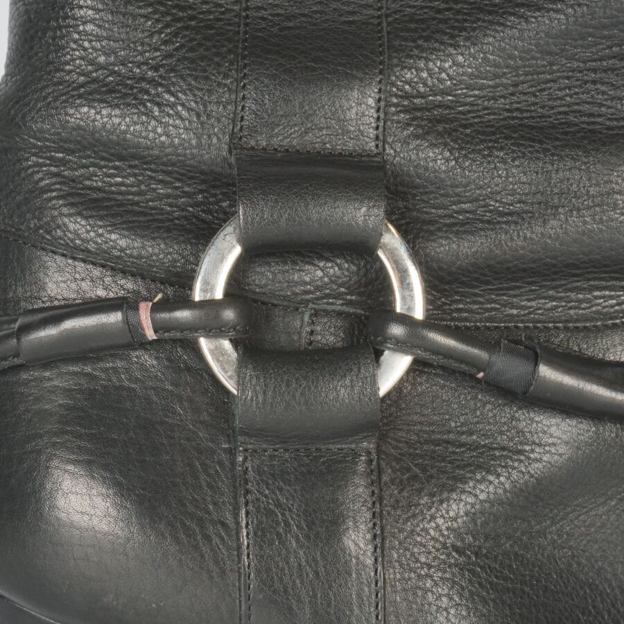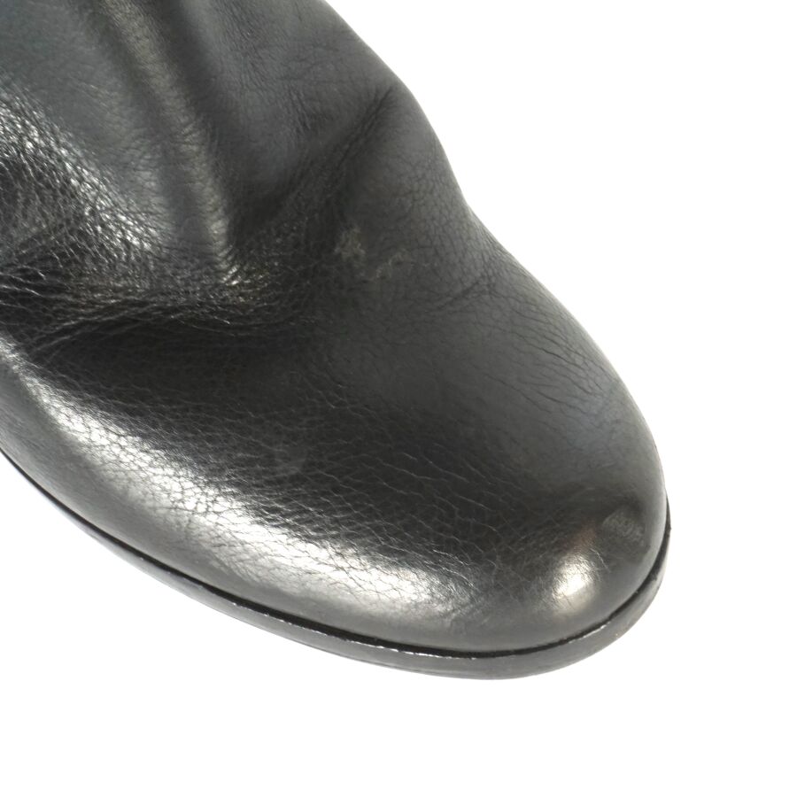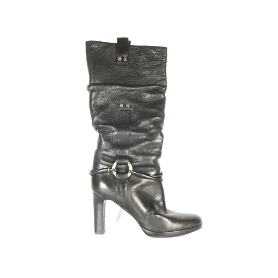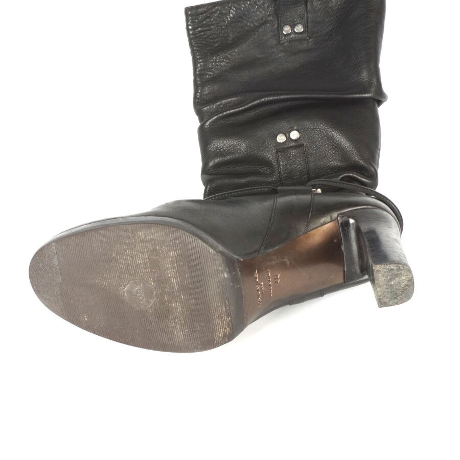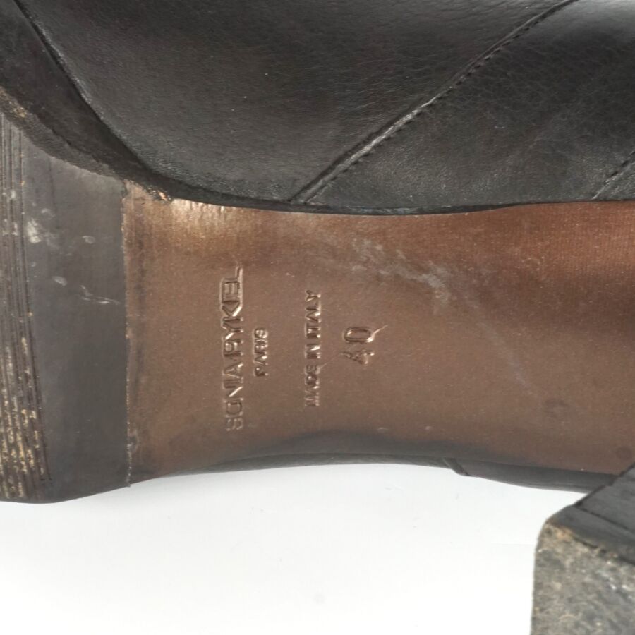 SONIA RYKIEL : Paire de bottes en cuir noir légèrement grainé et métal argenté monogrammé, taille indiquée 40, présentée dans sa boîte d'origine, H. Talon : 9.5 cm (quelques usures d'usage et griffures).