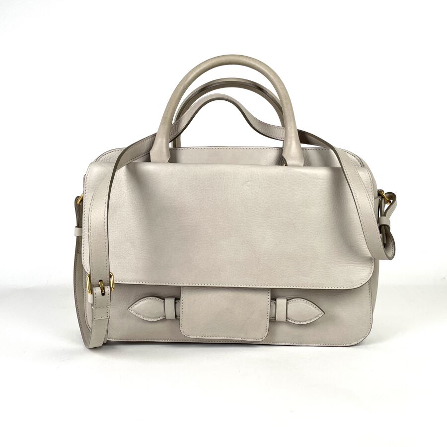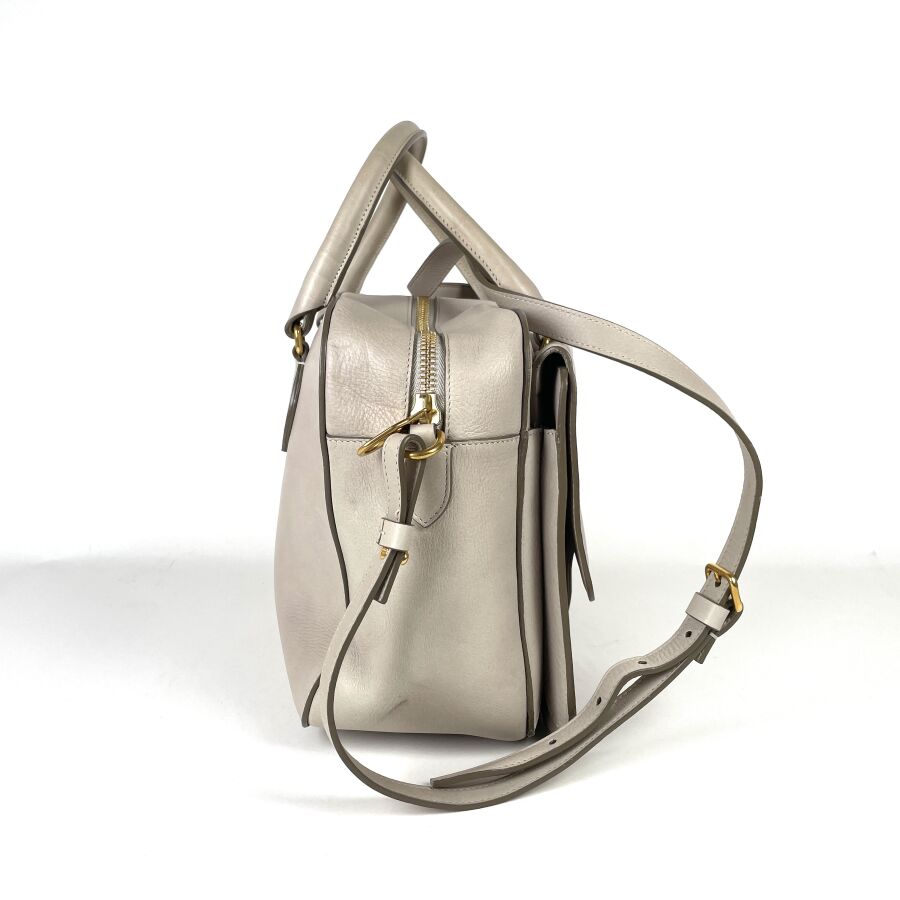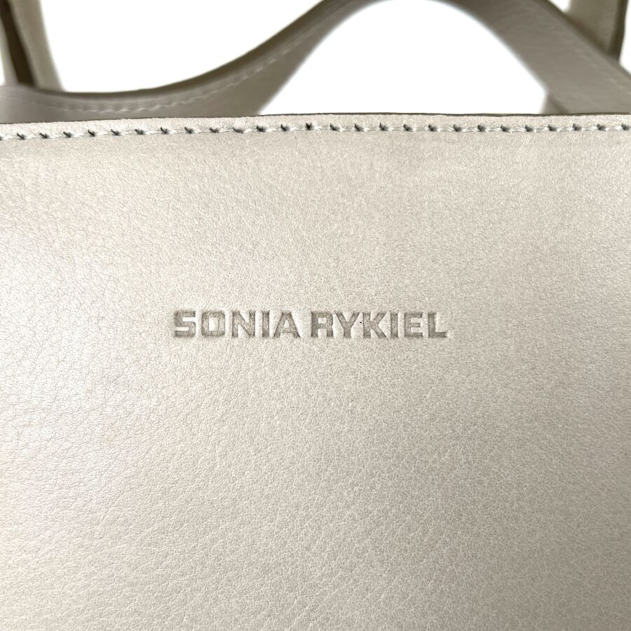 SONIA RYKIEL : Sac à main en cuir gris clair, muni de deux anses et d'une bandoulière réglable, une poche avant sous rabat et compartiment principal doublé, garnitures métalliques dorées, logo embossé au recto, fermeture à glissière, H. 22 cm. Long. 34 cm. Larg. 14 cm. (petites marques et frottements).