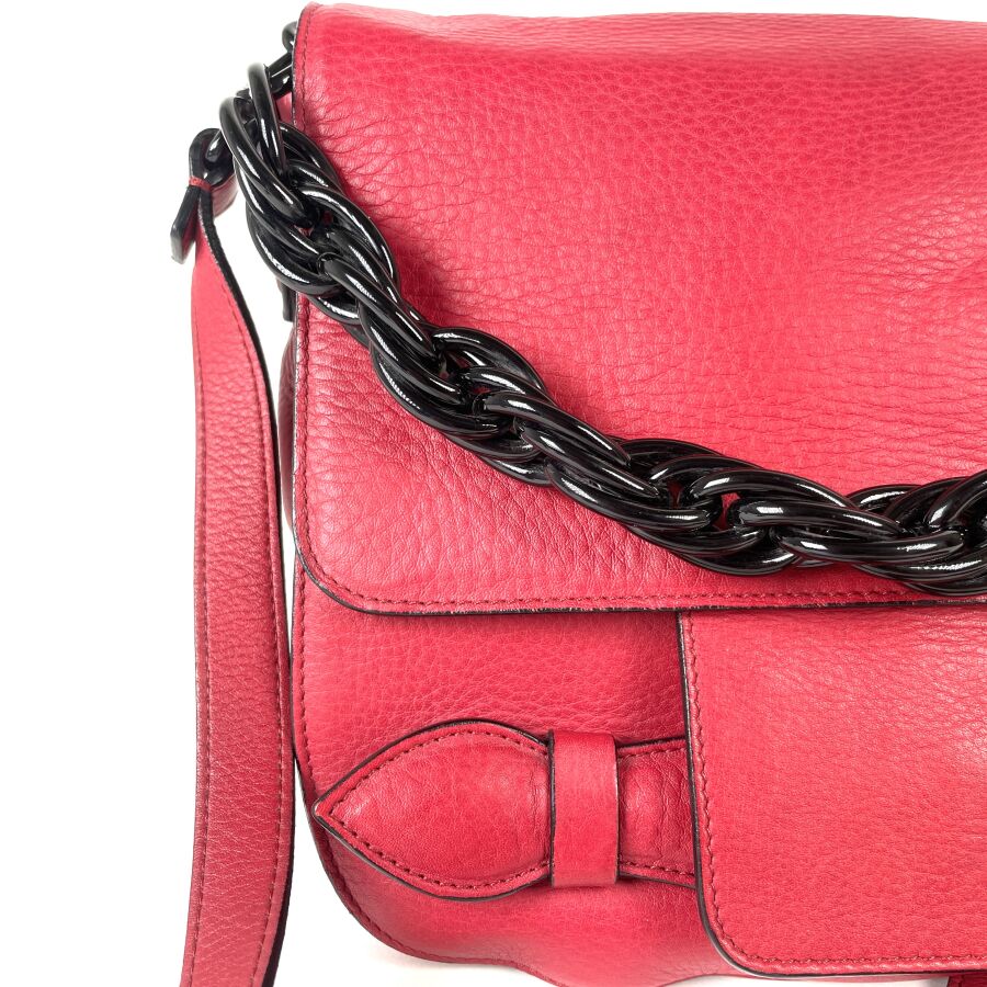 SONIA RYKIEL : Sac bandoulière en cuir grainé rouge framboise, intérieur en toile claire avec une poche zippée, muni d'une chaîne résine noire torsadée, fermeture par rabat avec poche frontale à patte structurée. . H. 22 cm. Long. 29 cm, (légers frottements d'usages).