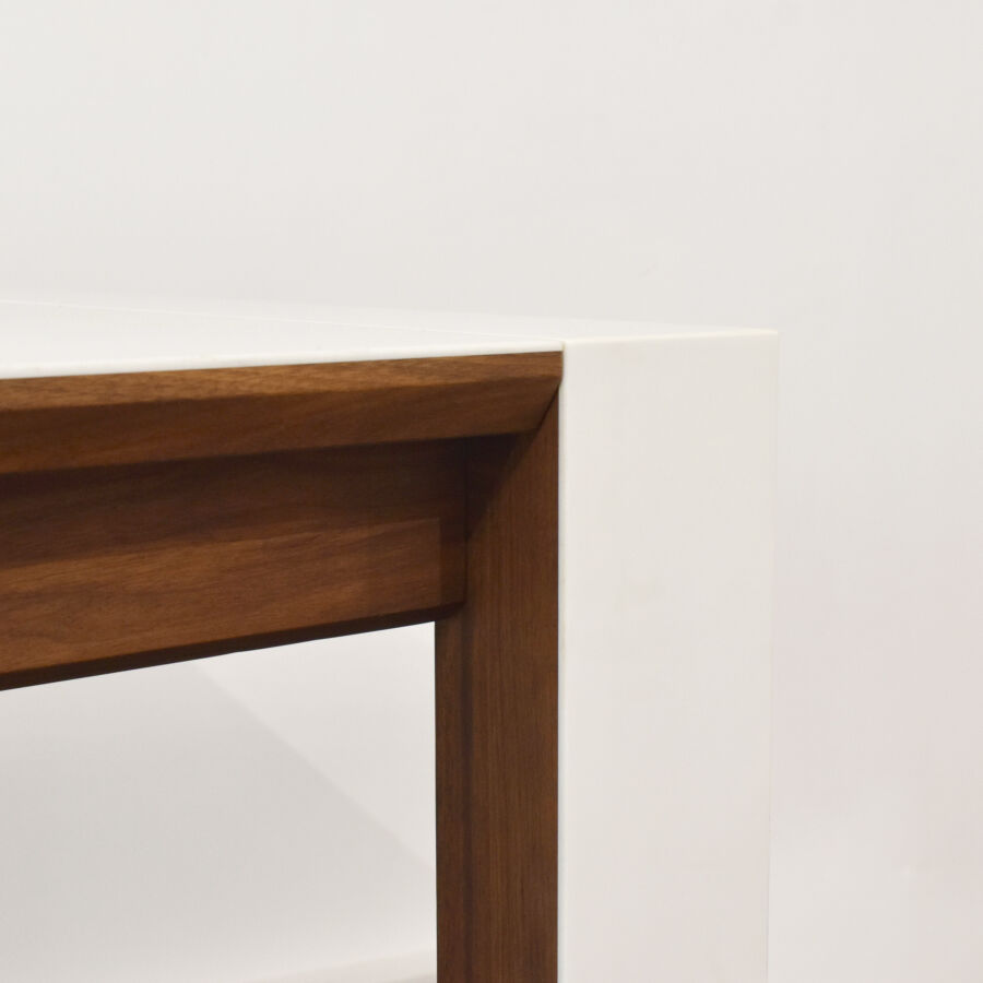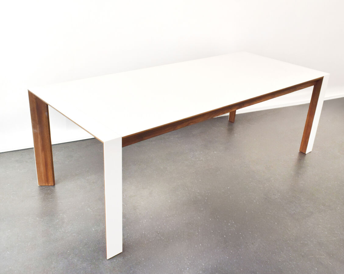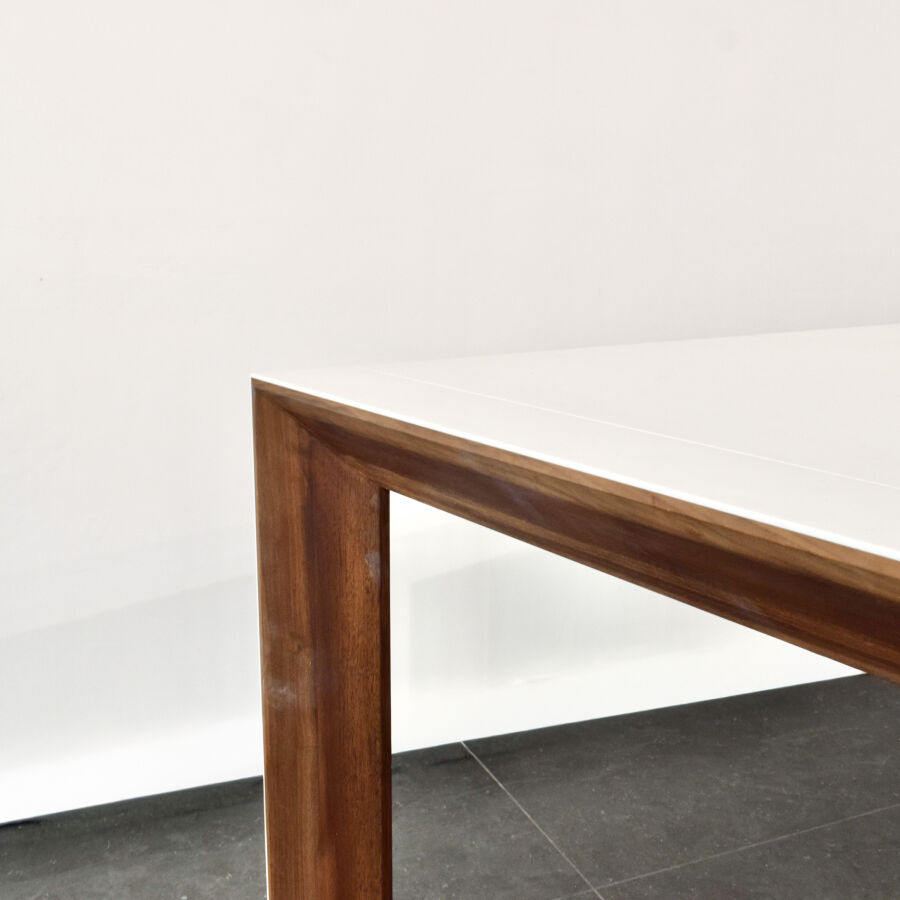 Søren NISSEN et Ebbe GEHL pour Naver Collection : Table modèle « GM 7700 » à une rallonge, en corian et noyer, 174 x 220 x 92 cm.