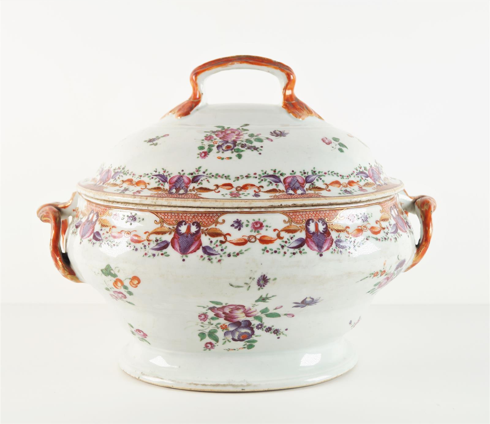 Soupière en porcelaine dans le goût de la Compagnie des Indes à décor de frises fleuries et feuillagées rehaussées d'or, L. 33 cm (rayures et usures).