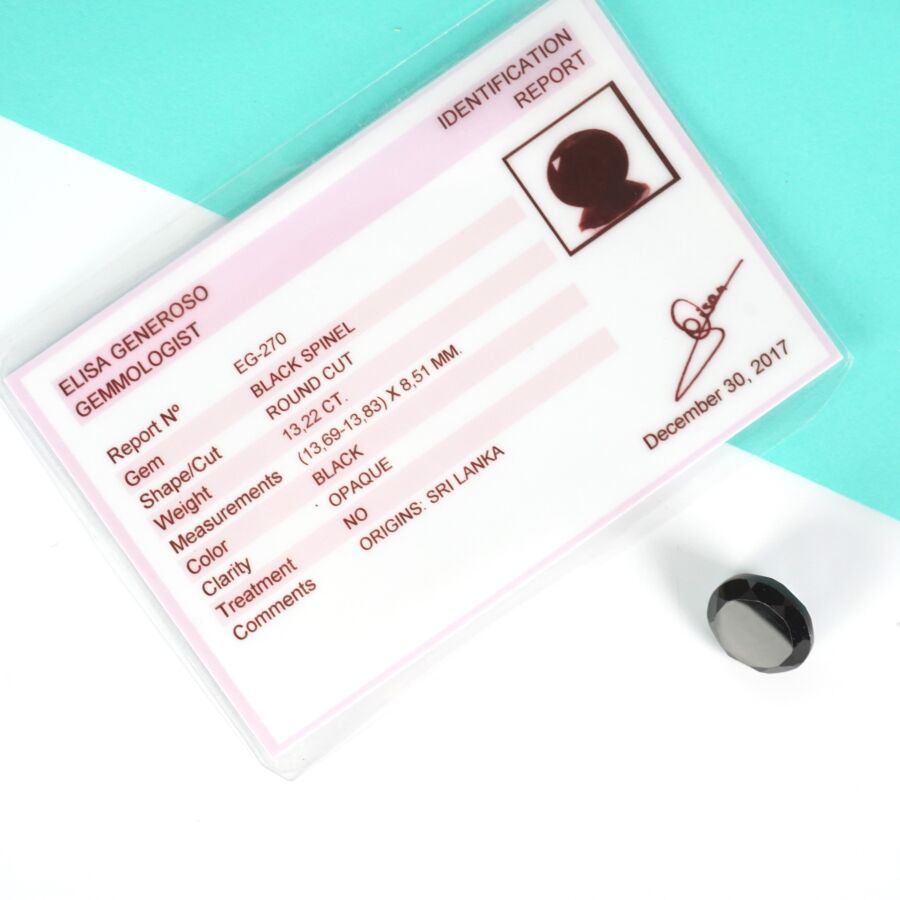 Spinel sur papier, forme ronde, couleur noire, calibrant 13.22 ct, Dim. 13.6 x 8.5 mm, présentée avec son certificat Elisa Generoso Gemmologist en date du 30 décembre 2017.