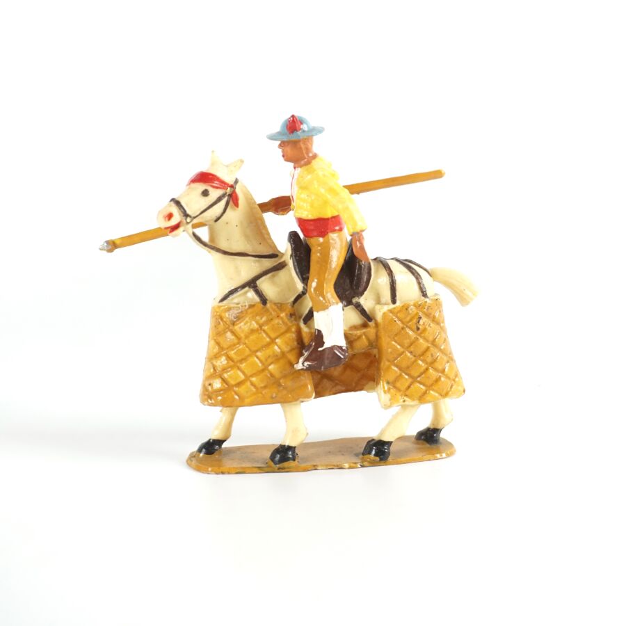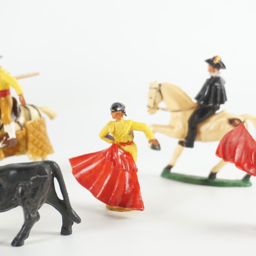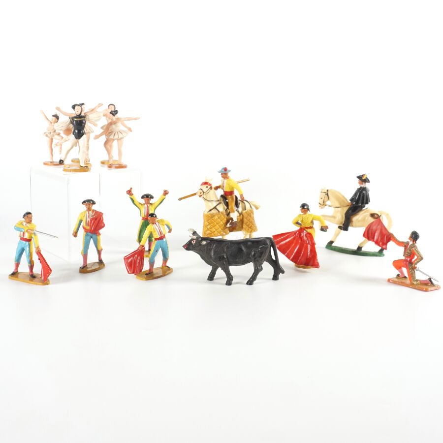 STARLUX : Ensemble de personnages sur le thème de la corrida, matière composite, comprenant deux taureaux (l'un cassé), deux cavaliers, et sept personnages. On joint également 5 danseuses classiques (quelques usures, brûlures).