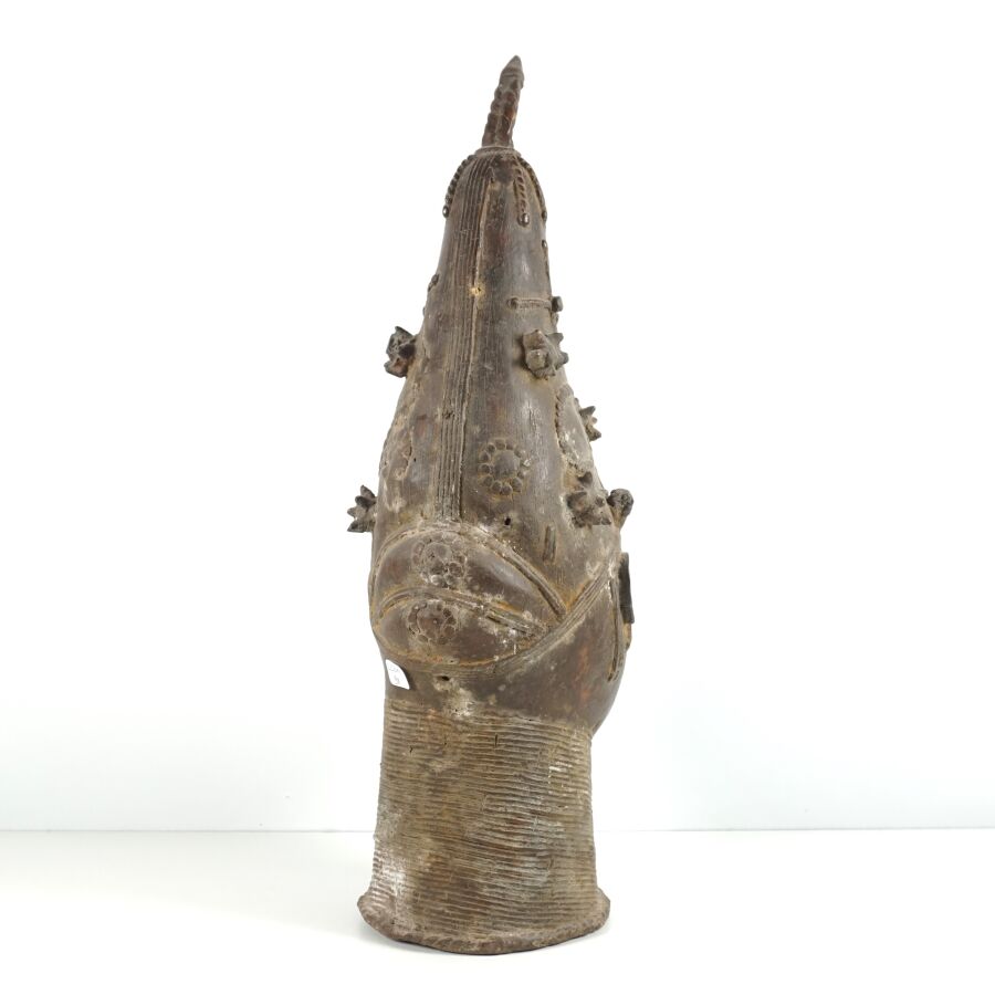 Statue, métal et bronze, figurant un visage féminin coiffé, Afrique, travail décoratif moderne, H. 33 cm (oxydations, usures).