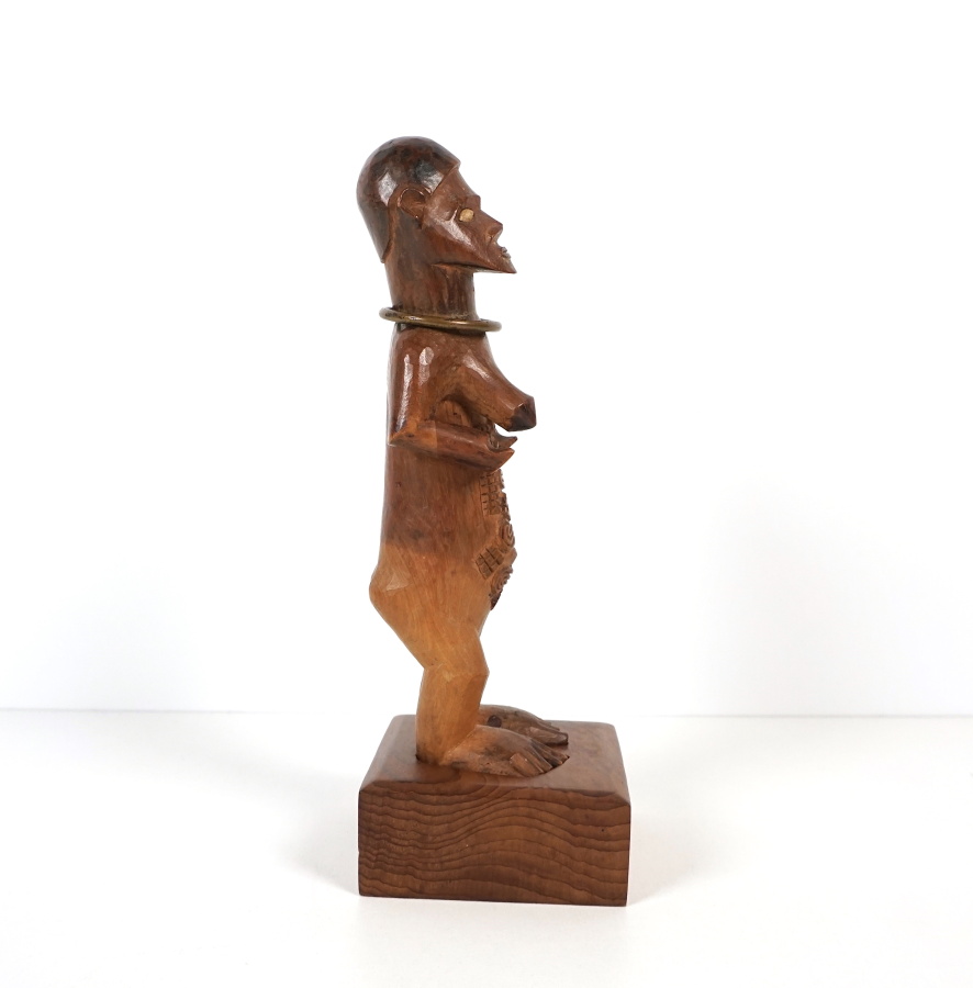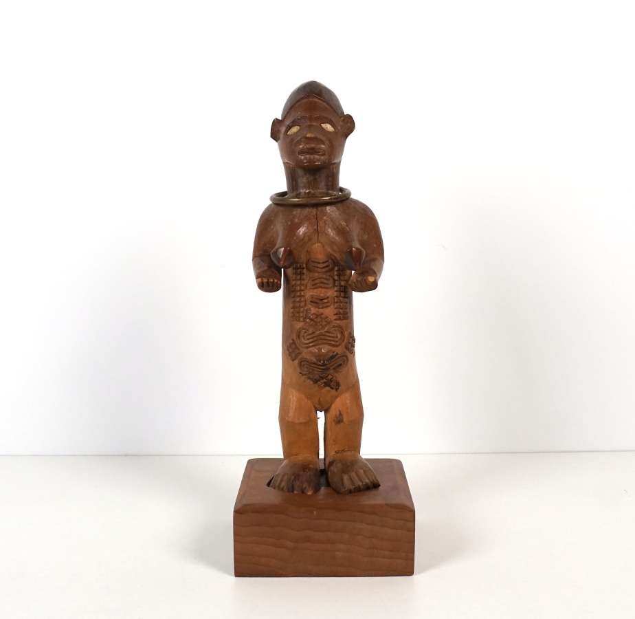 Statuette Bembe (Congo) figurant un personnage féminin debout, les avant-bras tendus, paumes des mains tournées vers le haut. L'abdomen est recouvert des classiques scarifications propres aux groupes Bembe. Les yeux sont incrustés d'éclats de faïence, elle porte un anneau de laiton autour du cou. La différence de patine atteste que la partie basse du corps était originellement enveloppée par un tissu maintenant une charge magique. Bois. H. : 17 cm (hors socle) (restauration au bras).