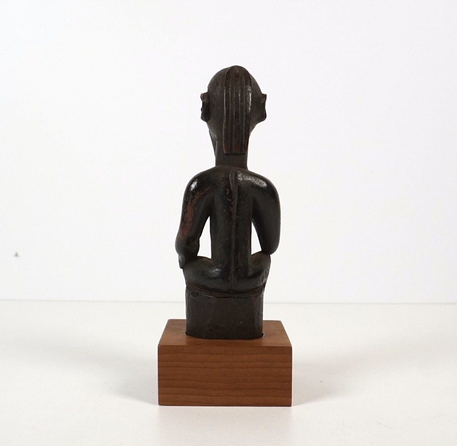 Statuette Bembe (Congo) figurant un personnage masculin à coiffe retombant vers l'arrière, assis tenant sa barbe de la main droite. Les yeux ont autrefois dû être incrustés d'éclats de faïence. Bois à patine fuligineuse, H. 16 cm (fentes et petits accidents visibles).