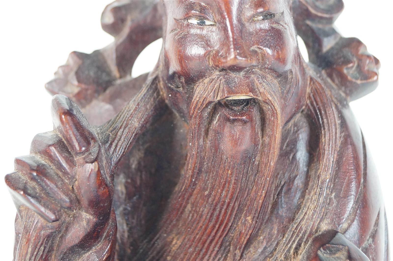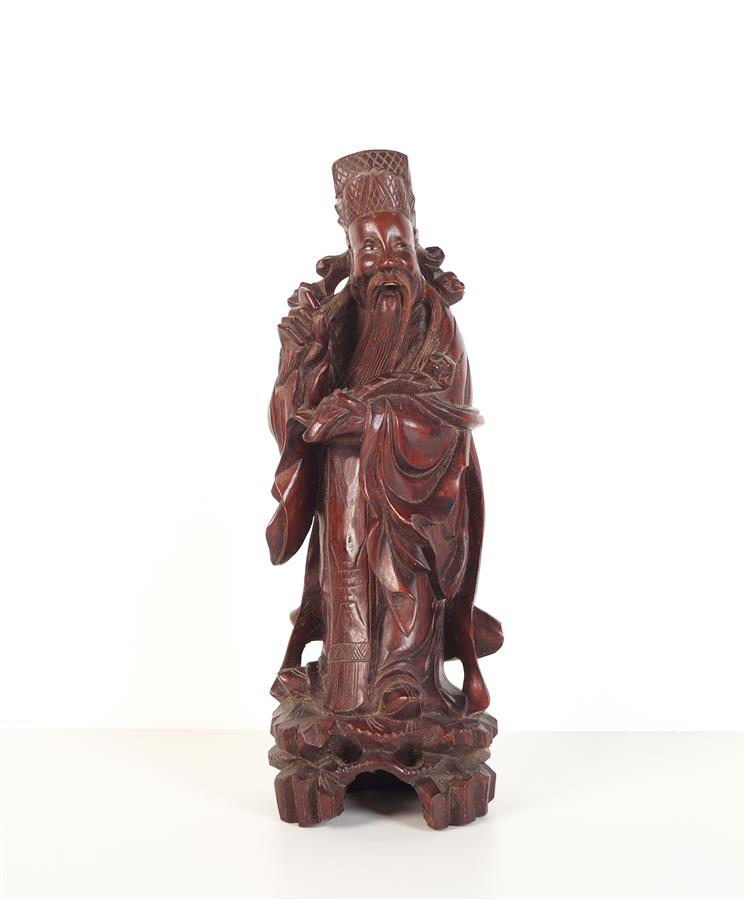 Statuette en bois exotique représentant un sage, yeux émaillés, Chine, 20e siècle, H. 36 cm (fissures au bois).