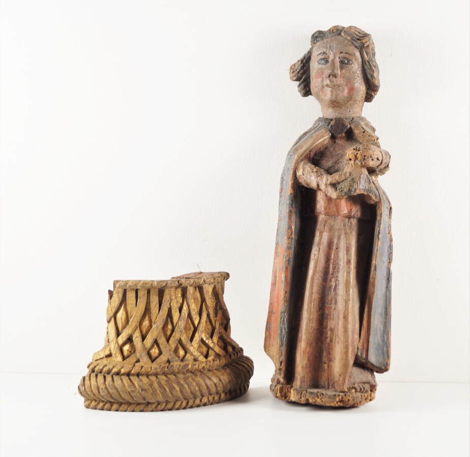 On joint un élément formant socle en bois sculpté, traces de dorure, H. 14 cm.