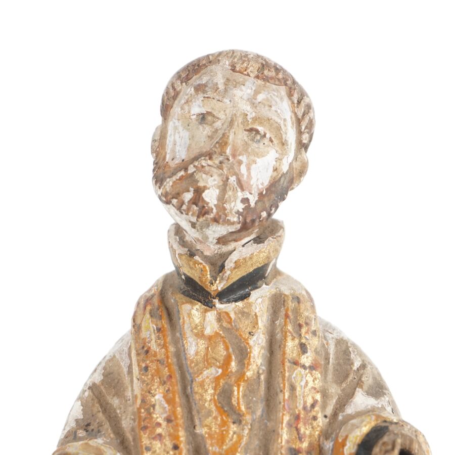 Statuette en bois sculpté polychrome et partiellement doré figurant un homme d'église, probablement Amérique du sud, 19ème siècle, H. 18.5 cm (manques les mains, écaillures et usures).