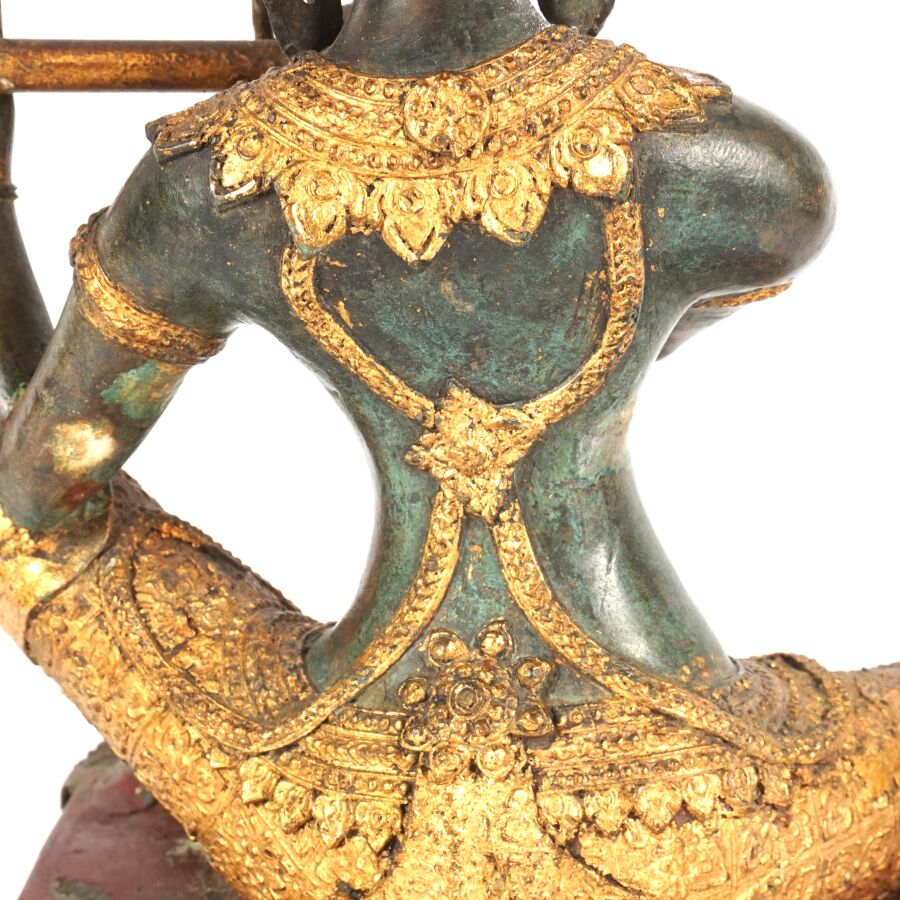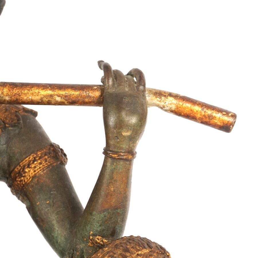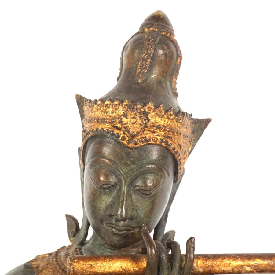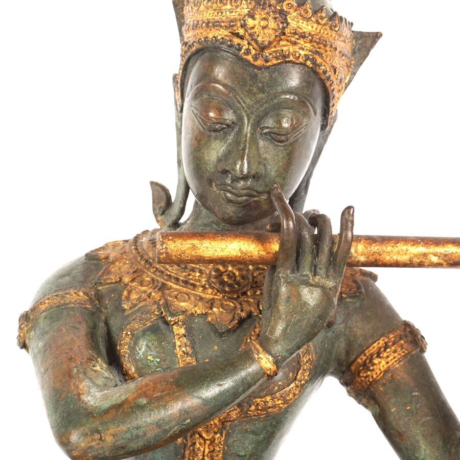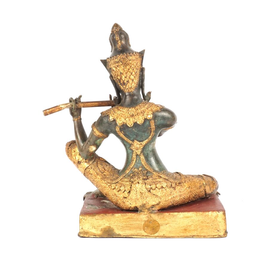 Statuette en bronze à patine verte, rouge et dorée figurant un joueur de flûte, Thaïlande, 20ème siècle, H. 31.5 cm. L. 22.5 cm (petites usures).