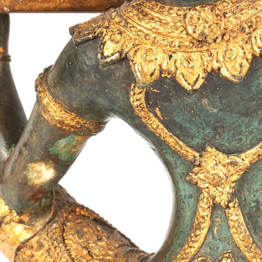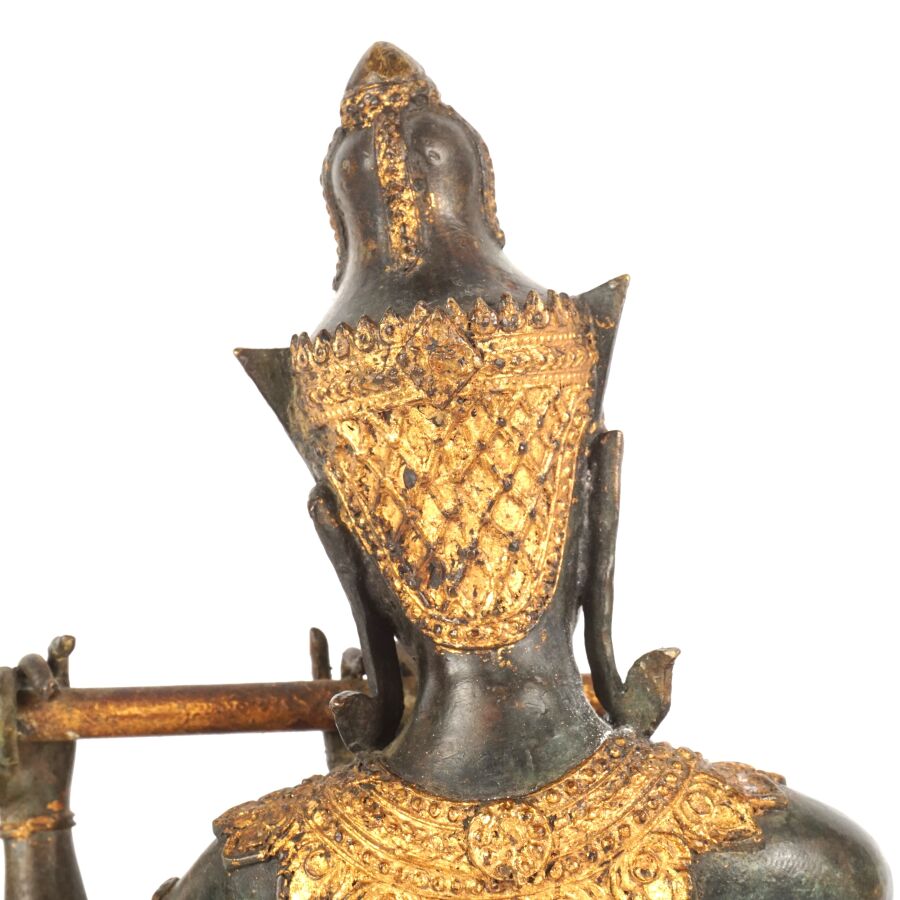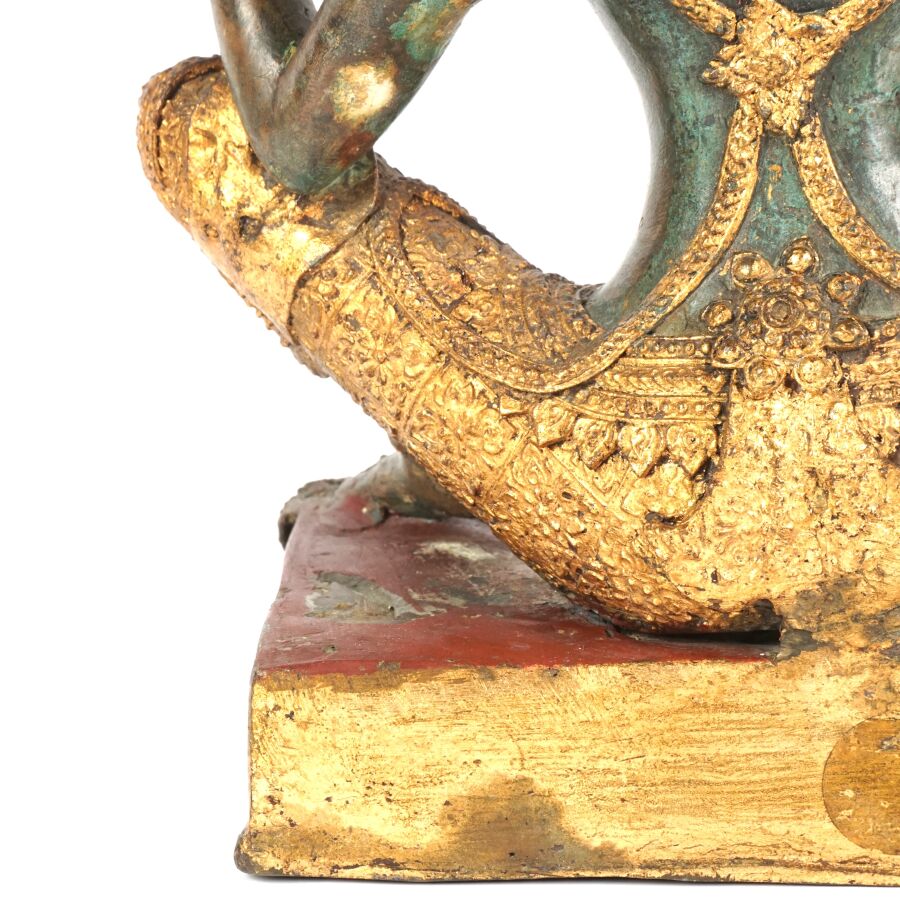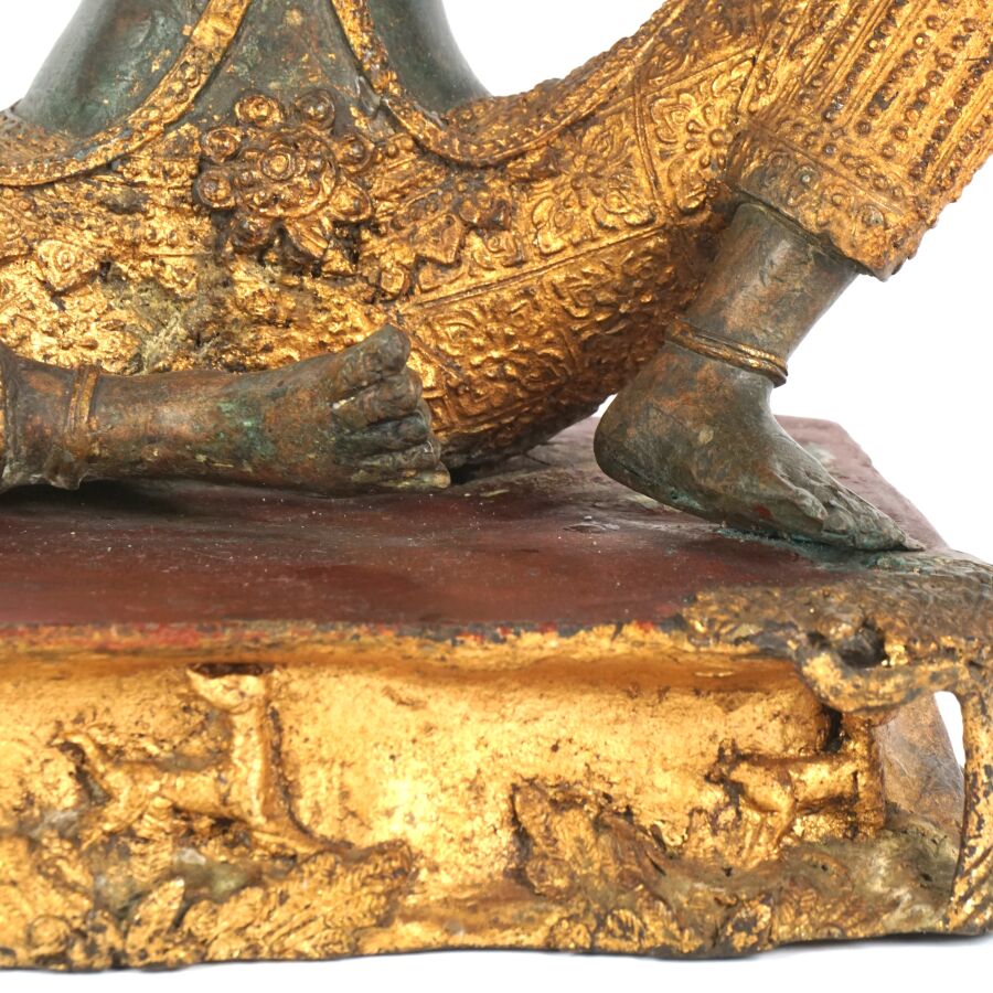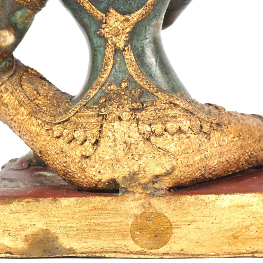 Statuette en bronze à patine verte, rouge et dorée figurant un joueur de flûte, Thaïlande, 20ème siècle, H. 31.5 cm. L. 22.5 cm (petites usures).