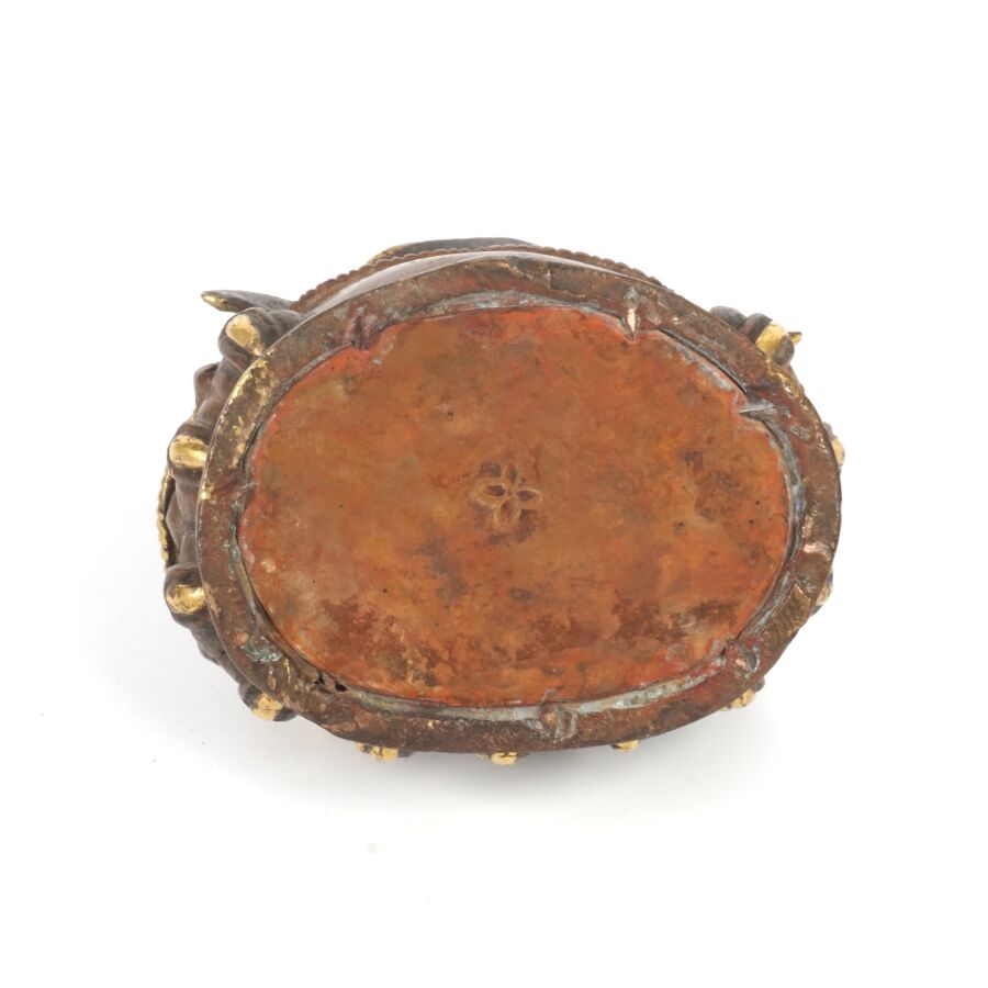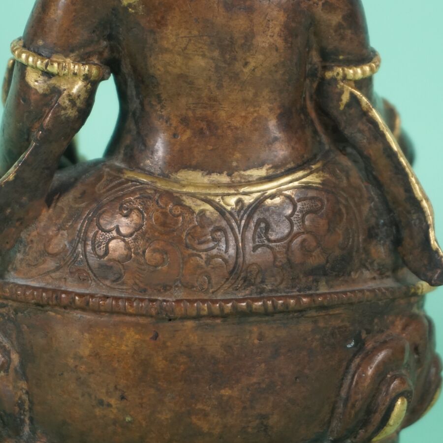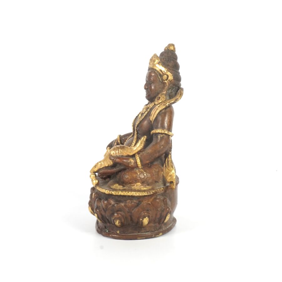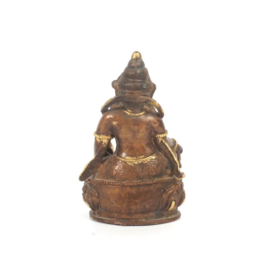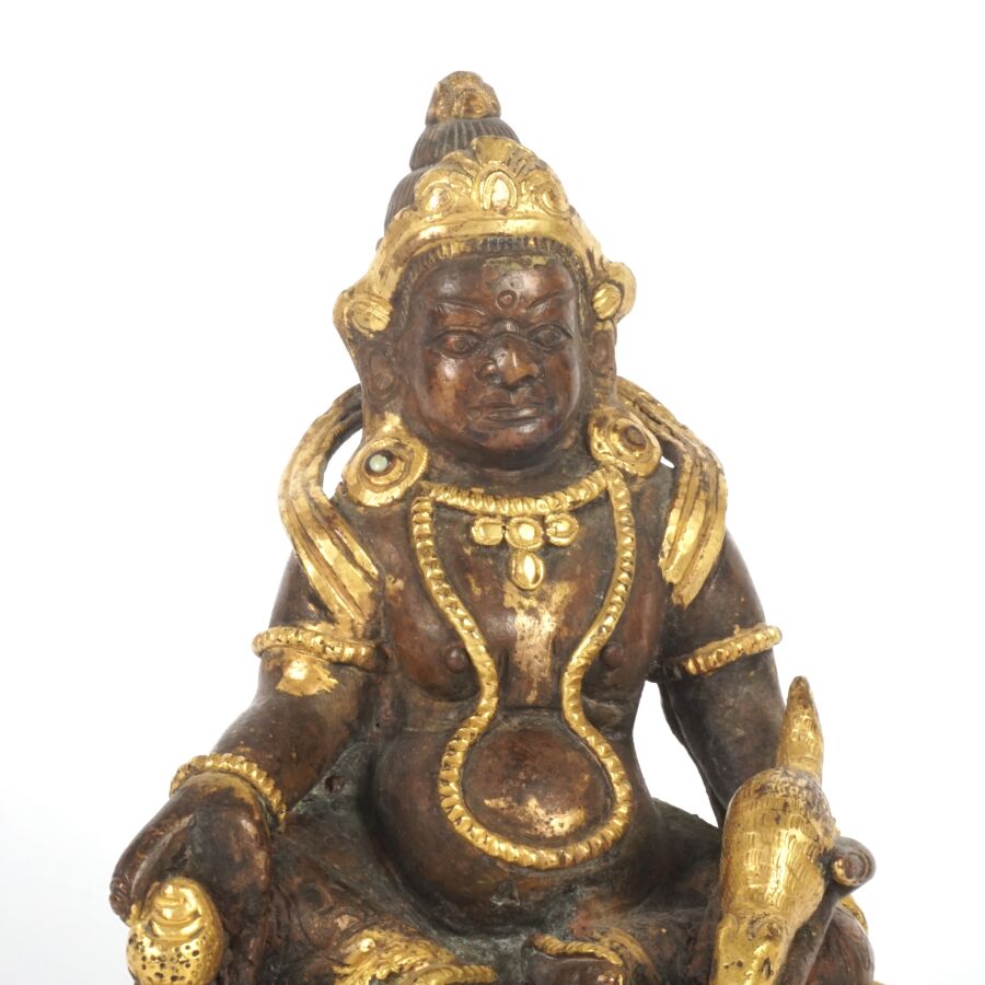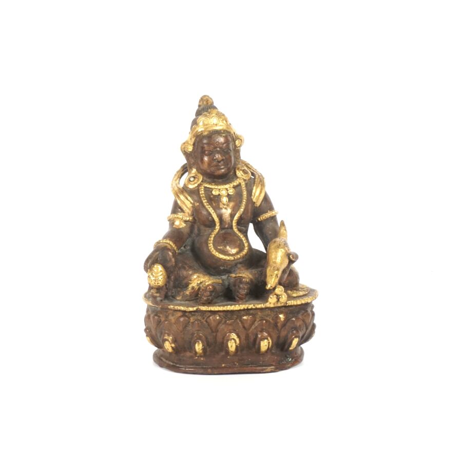 Statuette en cuivre figurant Jambhala ou Kubera, accompagné de sa mangouste sur le lotus, Tibet, début du 20ème siècle, H. 17 cm (petite usures normales à la patine, manque un cabochon dans la coiffe).