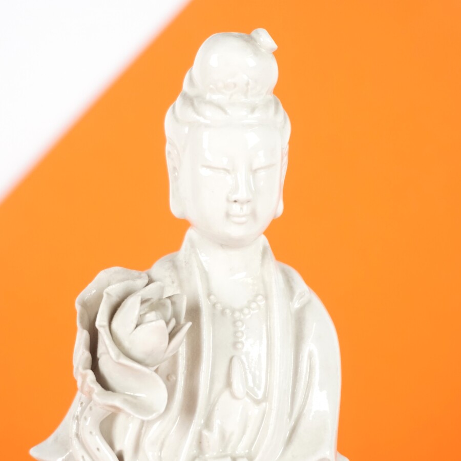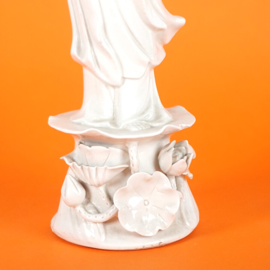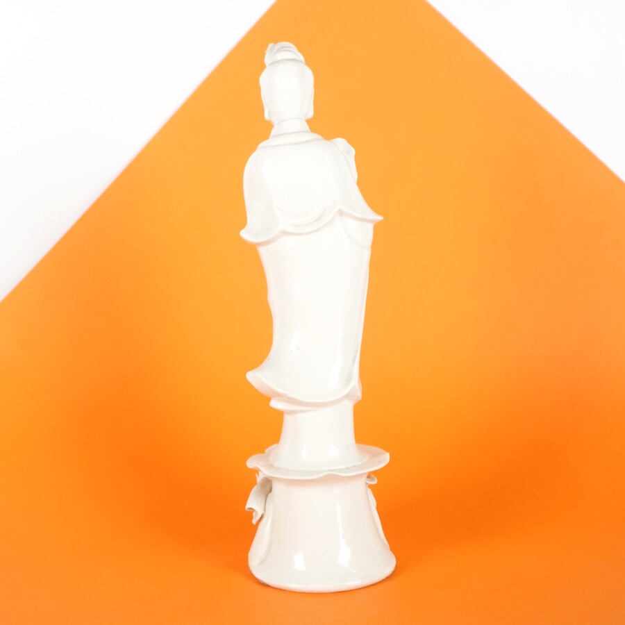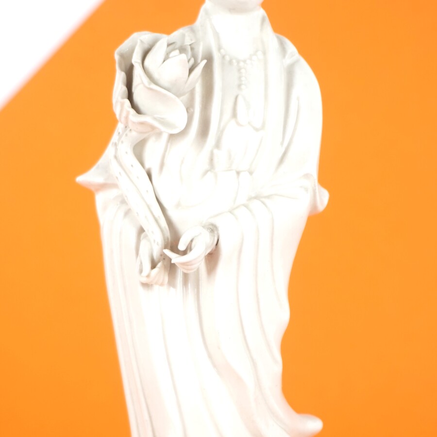 Statuette figurant une dame de cour au lotus, porcelaine émaillée dite blanc de Chine, Chine, 20ème siècle, H. 28 cm (éclats).