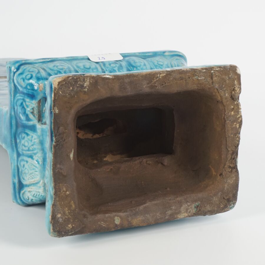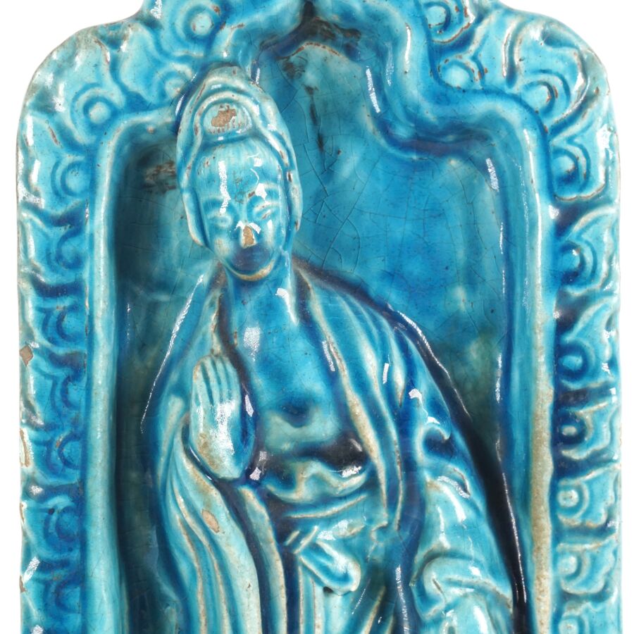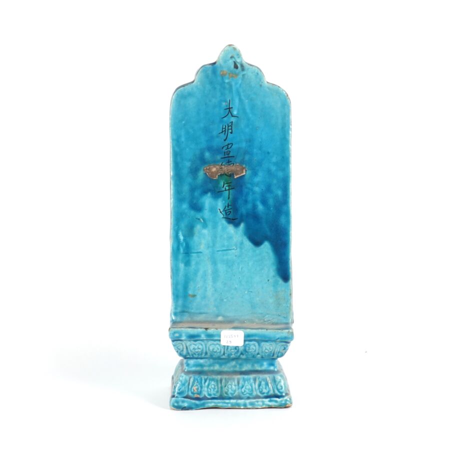 Stèle en terre cuite émaillée bleu turquoise représentant une divinité, calligraphies au revers évoquant Xuande Chine, 19ème siècle, H. 33 cm (égrenures et sauts d'émail).