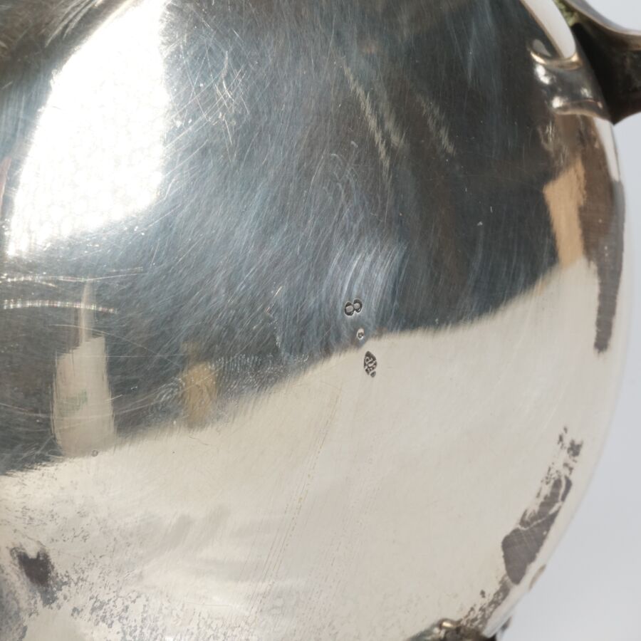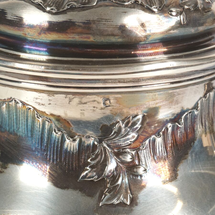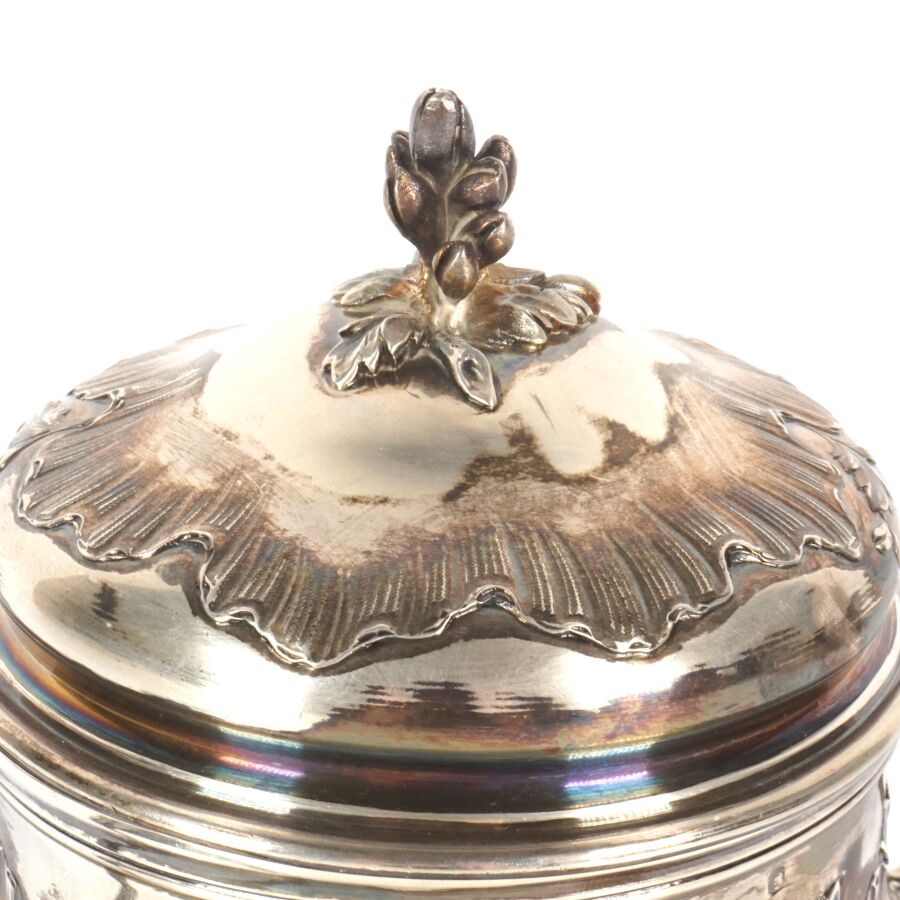 Sucrier en argent, poinçon Minerve 1er titre, à décor rocaille et de feuillages, avec son couvercle, la prise à motif de bourgeons, piétement à enroulement, H. 17 cm. Poids brut : 458 g environ.