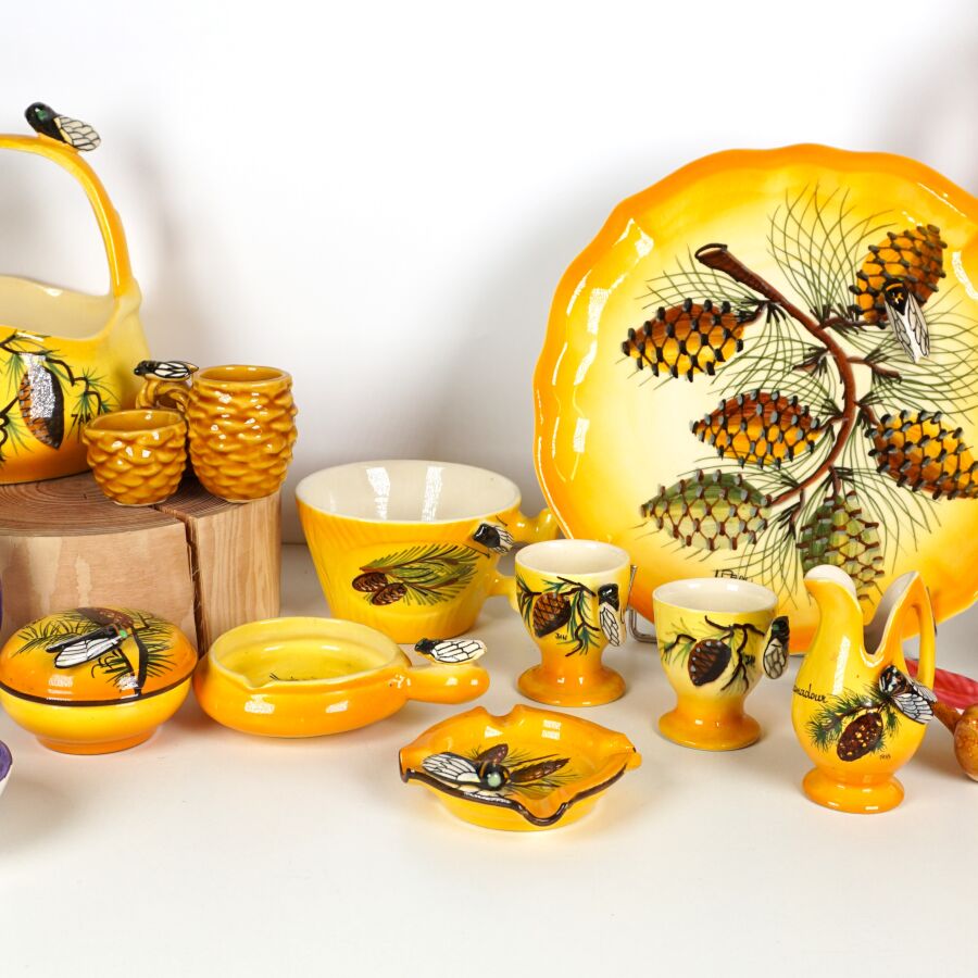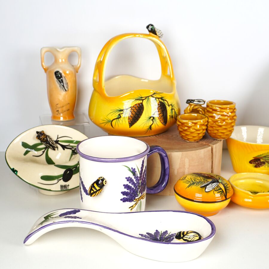 SUD DE LA FRANCE : Ensemble de 10 pièces en céramique émaillée polychrome à décor de cigales en applique et de pommes de pin sur fond jaune orangé comprenant assiette, coquetiers, tasse, pot-à-lait, etc. Certaines pièces signées, D. Assiette : 24.5cm. (éclats).