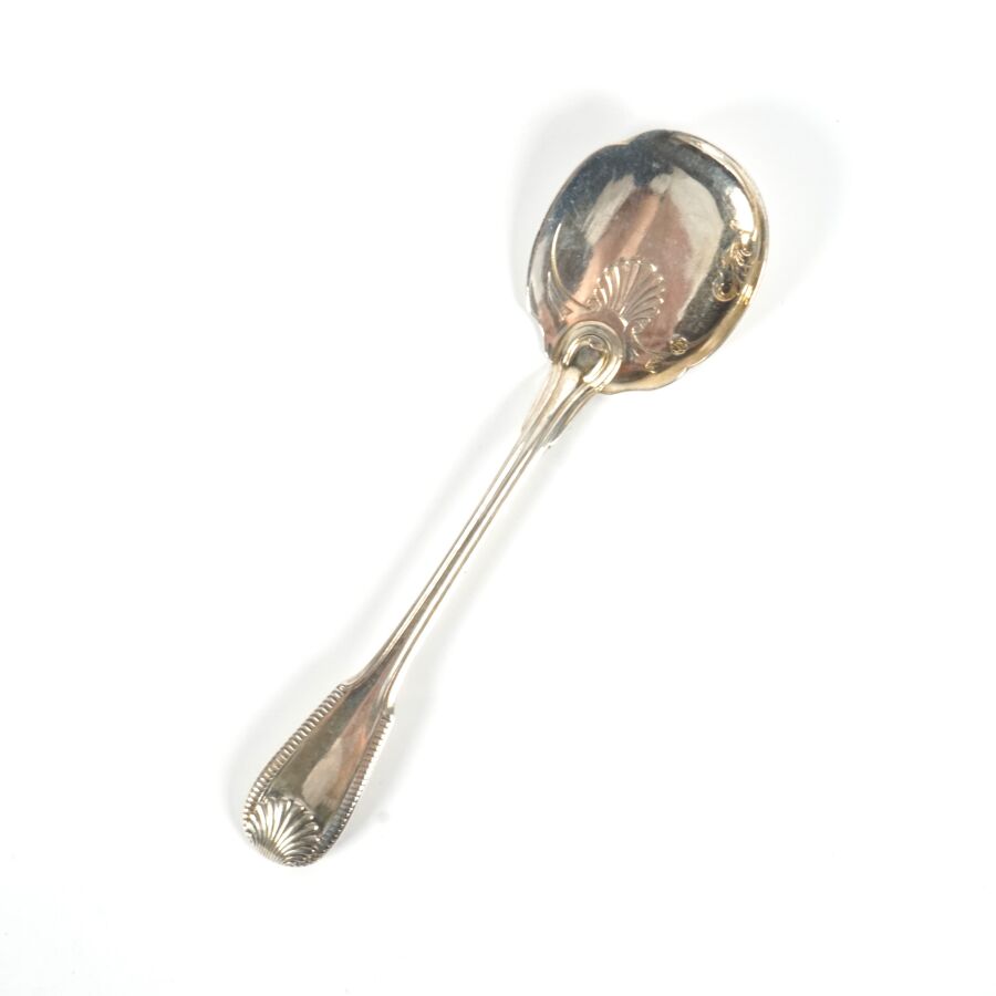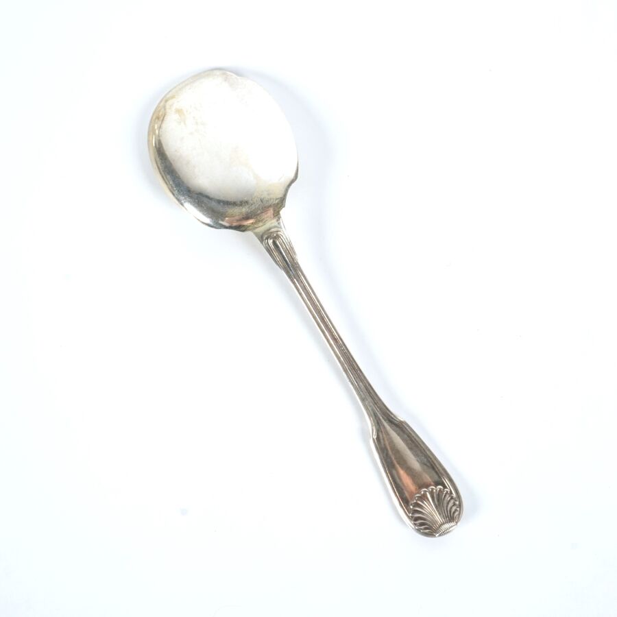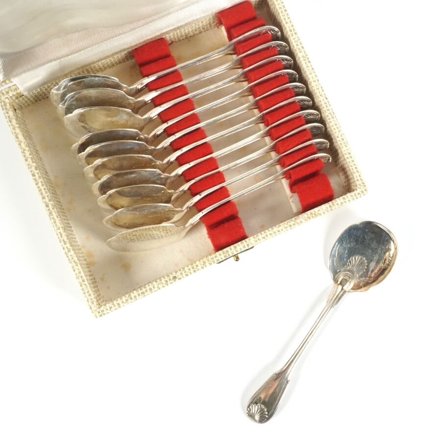 Suite de 11 cuillères à glace en argent, poinçon Minerve 1er titre, poinçon MO "DR - Paris", le différend à motif d'un rectangle plein, à décor de coquilles et double filet, L. 13.5 cm. Poids brut : 320 g environ.