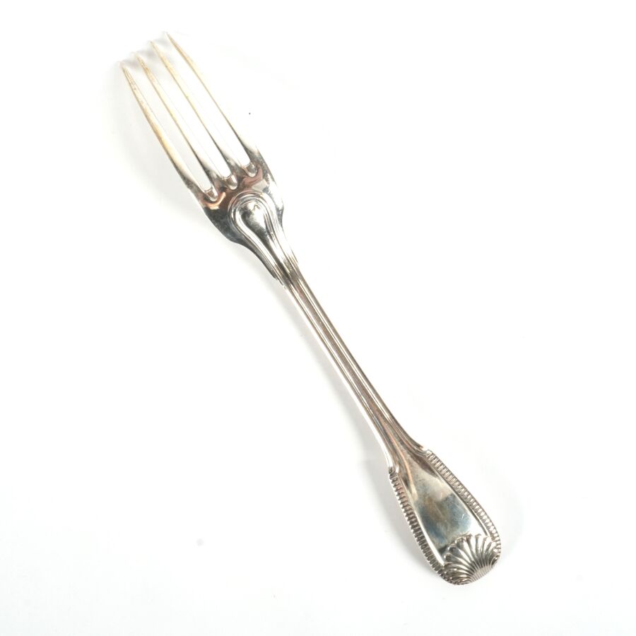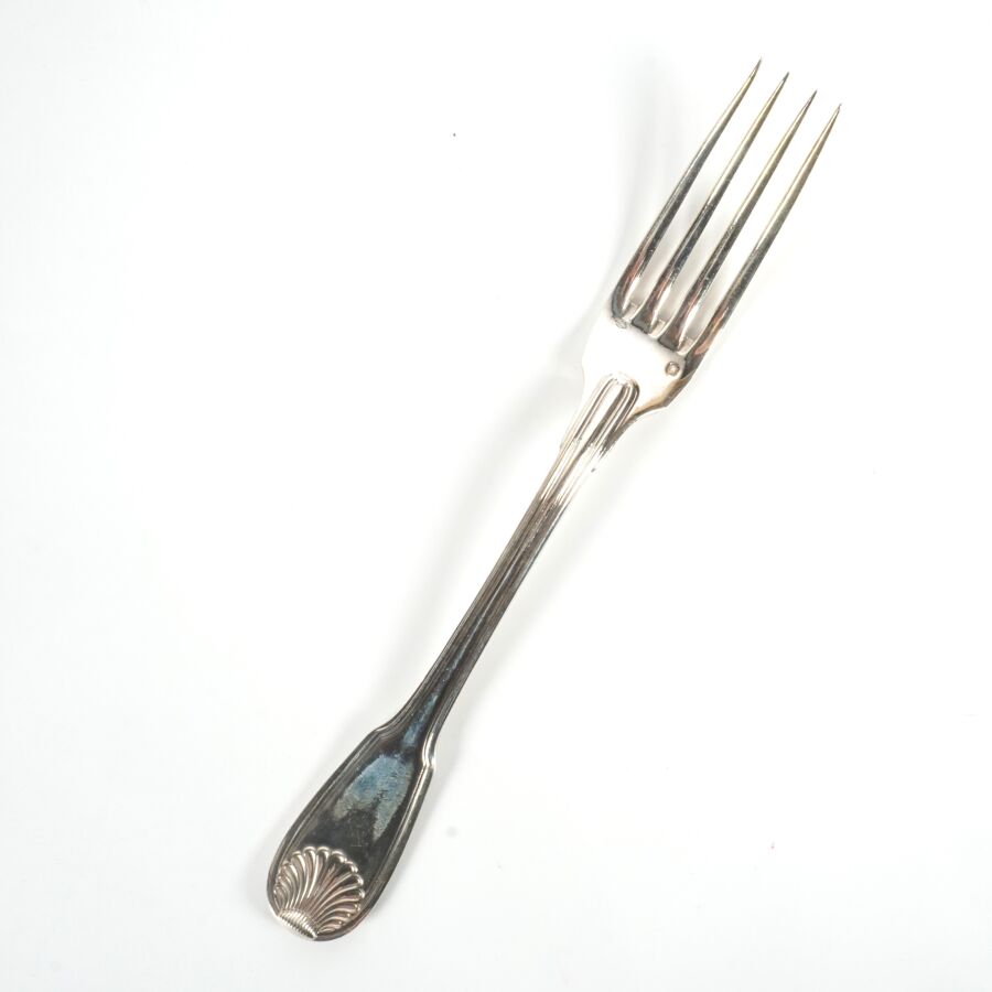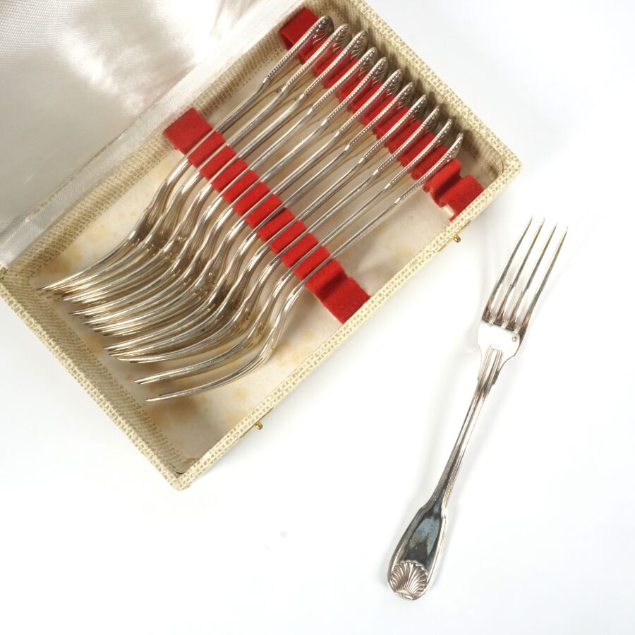 Suite de 12 fourchettes en argent, poinçon Minerve 1er titre, poinçon MO "DR - Paris", le différend à motif d'un rectangle plein, à décor de coquilles et double filet, L. 21 cm. Poids brut : 956 g environ.