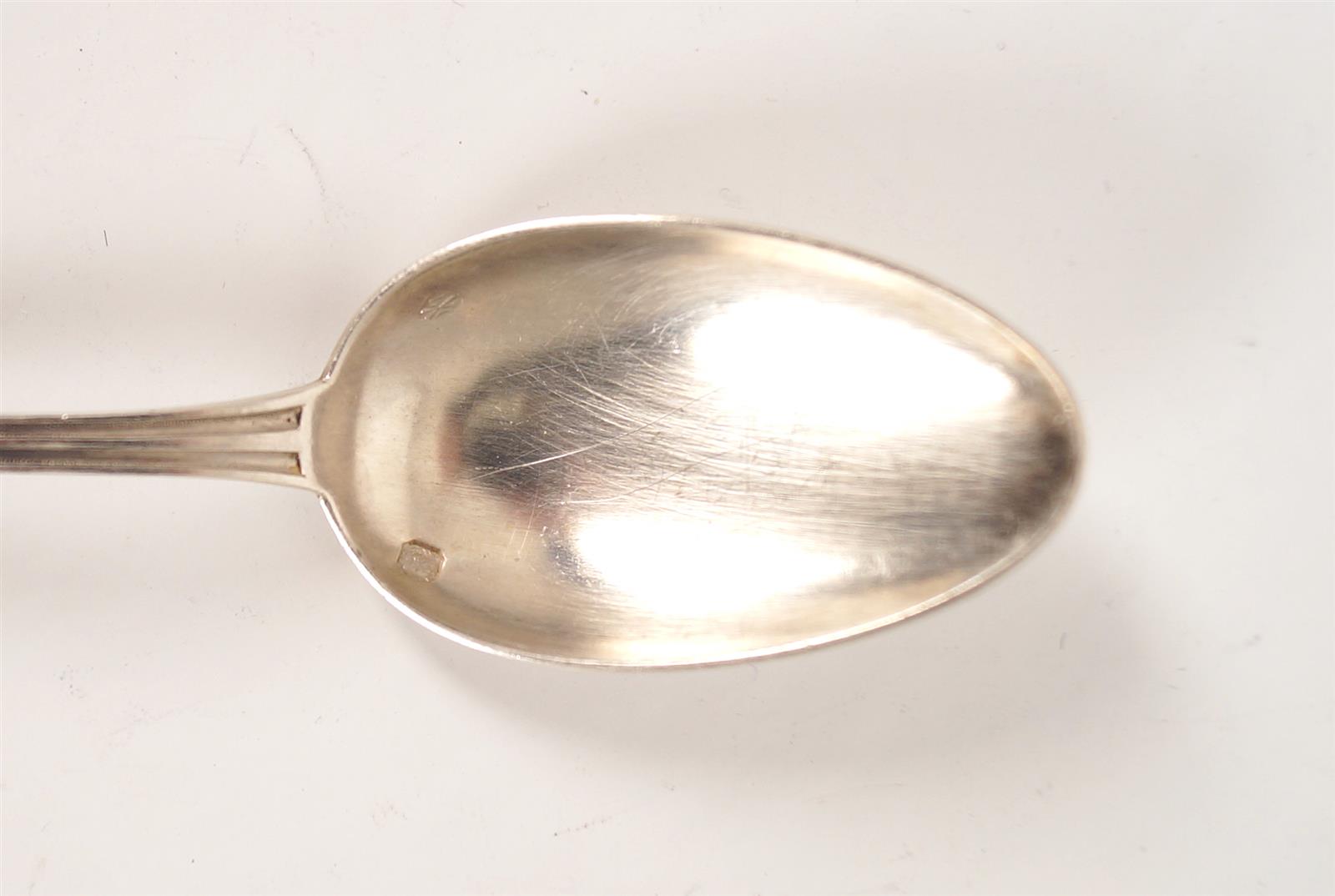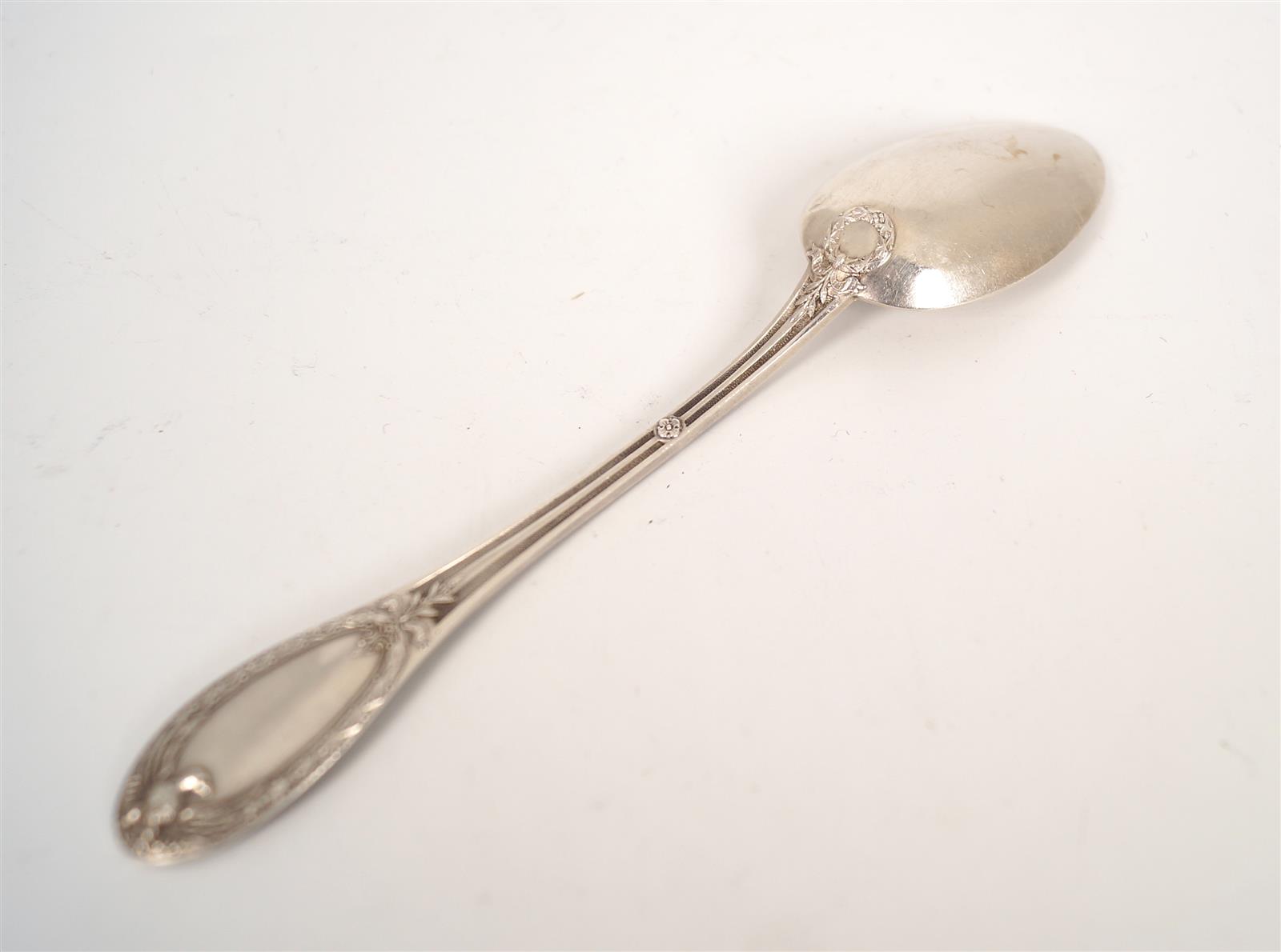 Suite de 12 petites cuillères en argent, poinçon Minerve, poinçon de MO "L" et deux crosses entrecroisées, à décor d'aigle et de lauriers. L. 13 cm. Poids brut : 227 g environ.