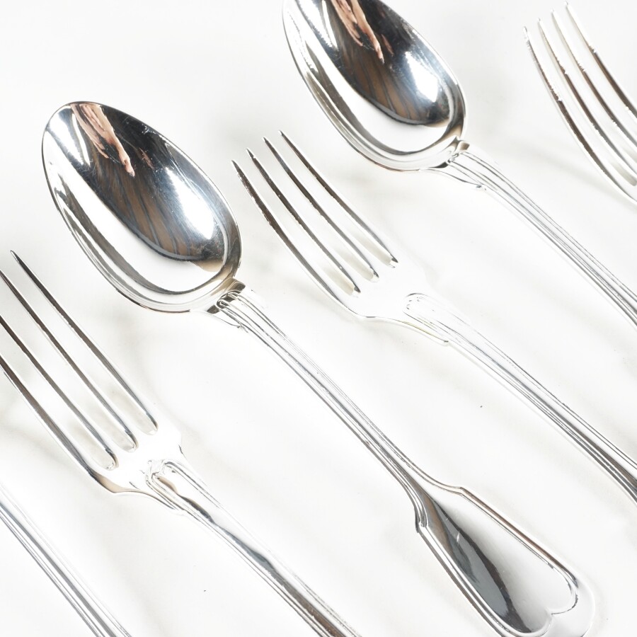 Suite de 6 couverts en métal argenté, modèle filets. On y joint 3 cuillères du même modèle.
