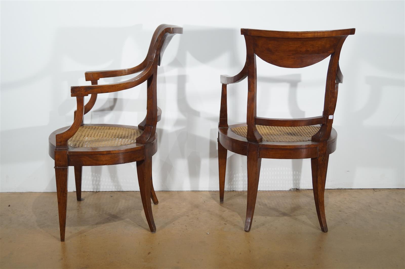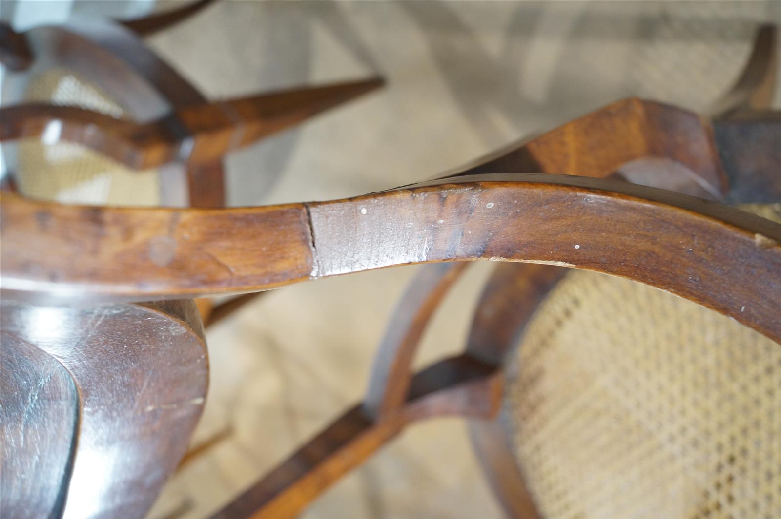 Suite de 6 fauteuils en acajou et placage d'acajou, dossiers renversés ajourés, assises à fond de canne, piétement anvant gaine, piétement arrière sabre, fin 19e siècle, 54 cm x 47.5 x H. 90 cm (accidents et manques, restaurations).
