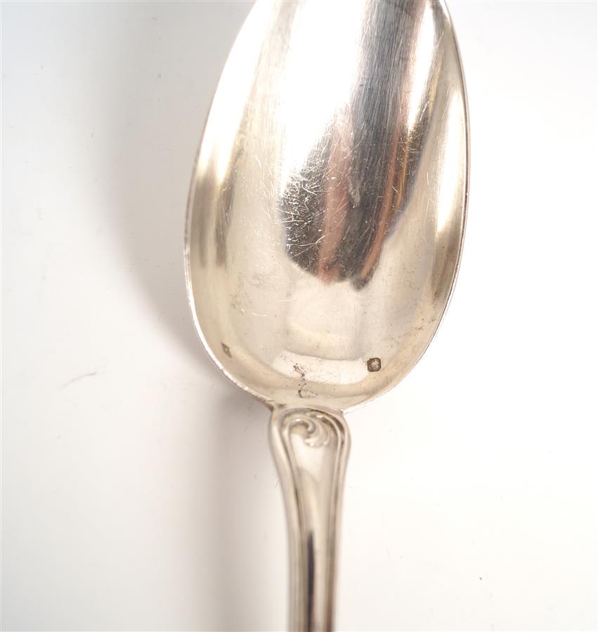 Suite de 6 fourchettes et 3 cuillères en argent, poinçon Minerve, modèle coquille feuillagée, L. 21.5 cm. Poids brut : 764 g environ.