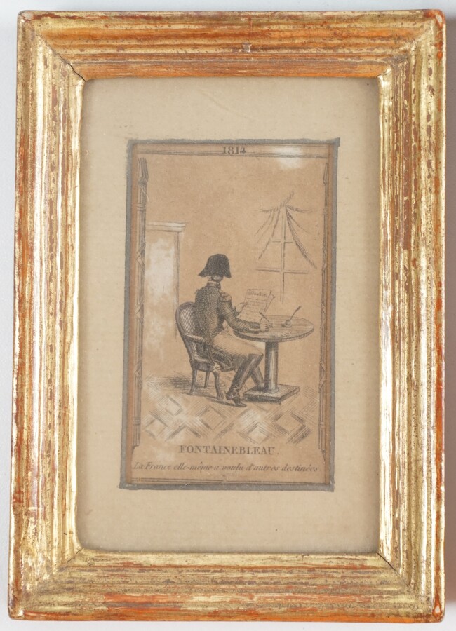 Suite de 6 petits encadrements à sujet napoléonien représentant différents épisodes de la vie de Napoléon Ier, 7.5 x 4 cm (à vue).