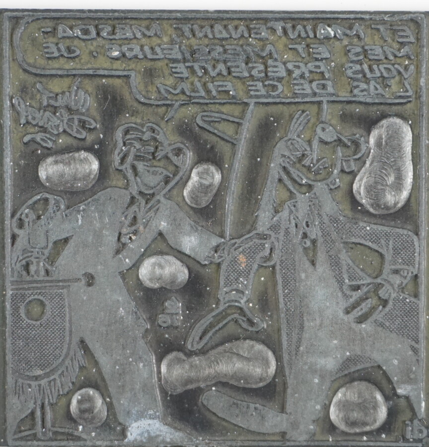 Suite de 7 plaques d'impression de bandes-dessinées Mickey, plaque métal, L. 19.8 cm.