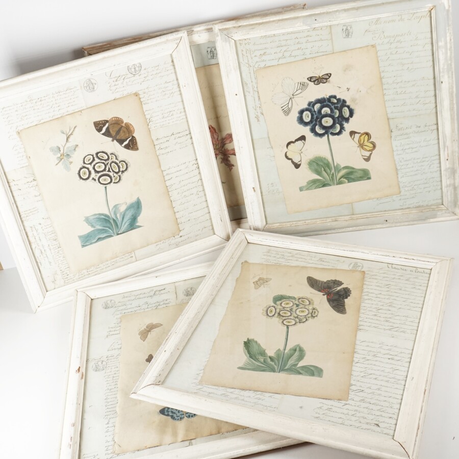 Suite de cinq aquarelles et collages sur papier figurant fleurs et papillons, sur fond de manuscrits et de lettres administratives, fin du 18ème - début du 19ème siècle, 50 x 46 cm.