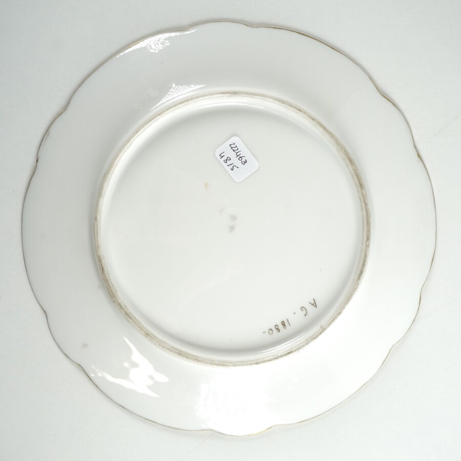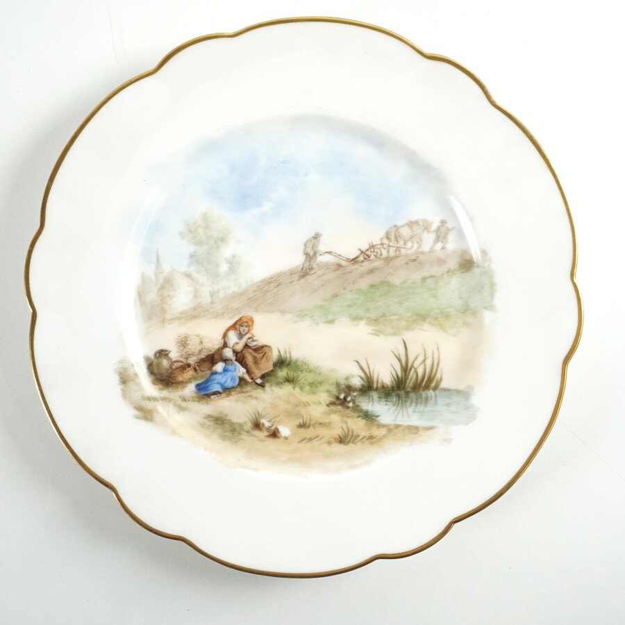 Suite de cinq assiettes floriformes, porcelaine émaillée polychrome et rehauts d'or, à décor imprimé de scènes paysages et angelots, fin 19e siècle, Diam : 23.7 cm (petites usures à l'émail).