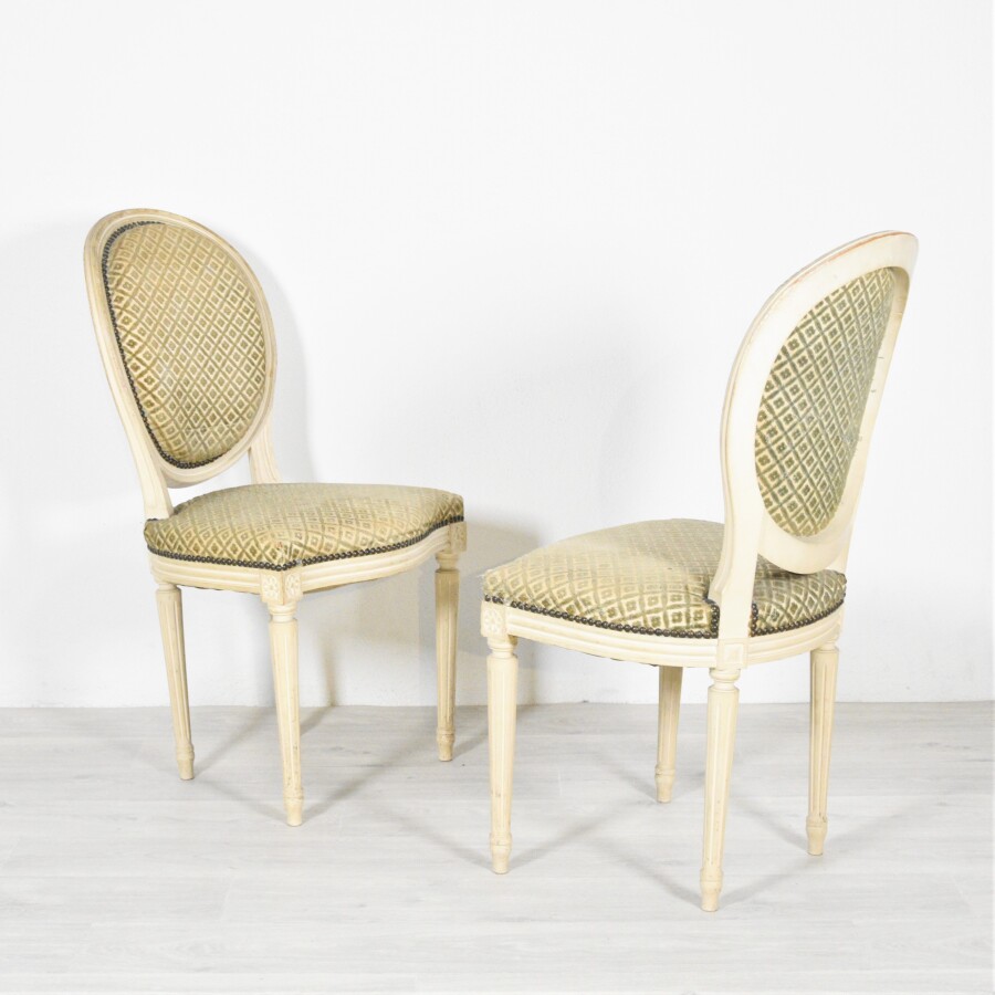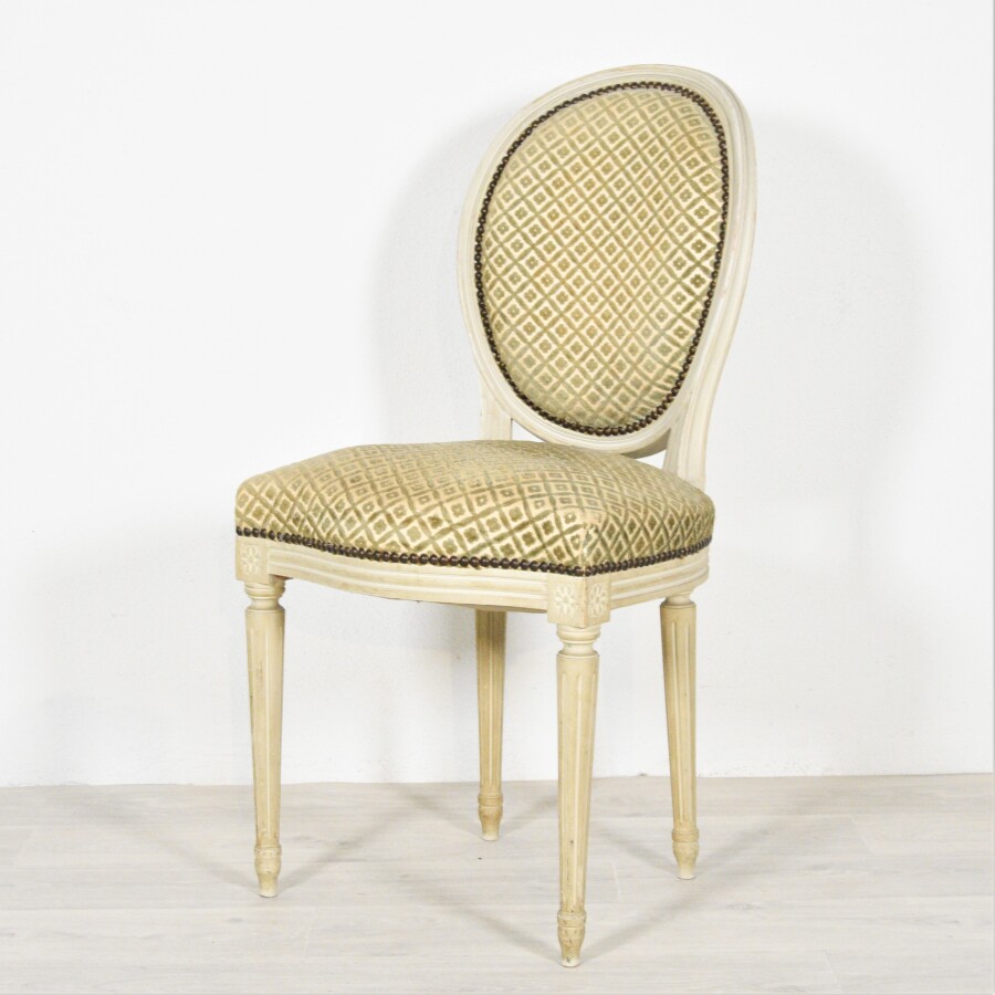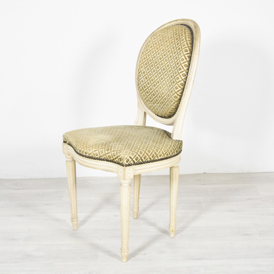 Suite de cinq chaises de style Louis XVI, en bois sculpté et laqué blanc, dossier médaillon, piétement cannelé, garniture de tissu beige à motif de fleurettes vertes dans des croisillons en velours, H. 89 cm (taches).