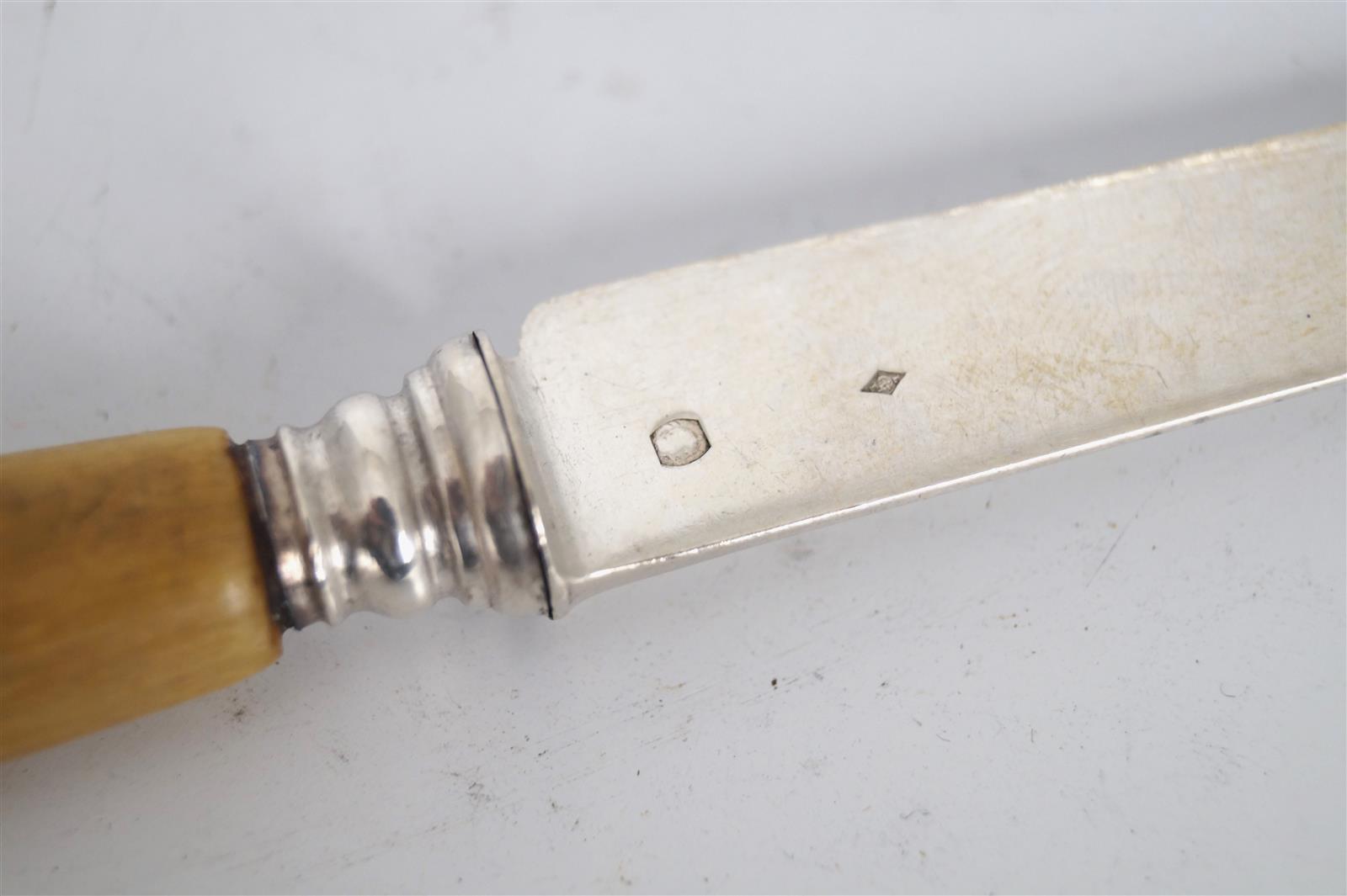 Suite de cinq couteaux lame en argent, poinçon Minerve 800, poinçon MO "LL", manche en corne, L. 19 cm. Poids brut : 145 g environ.