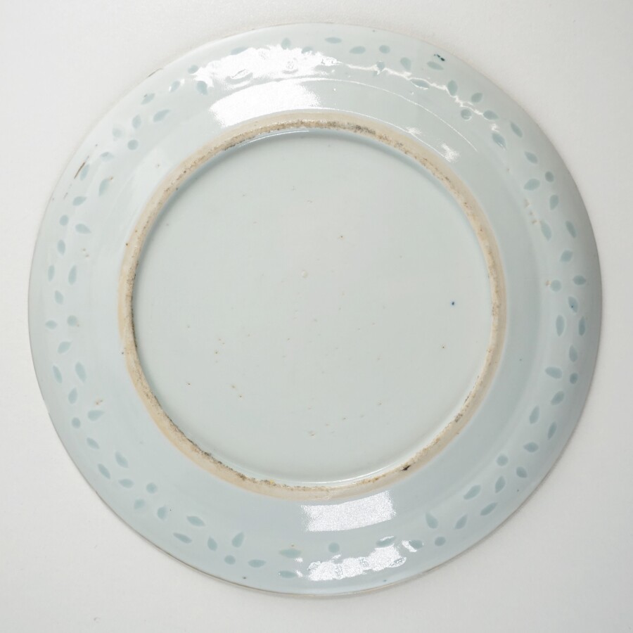 Suite de douze assiettes, porcelaine émaillée et rehauts d'or, à décor de lotus, la bordure dite en "grain de riz" sur fond Ducaï, Chine, circa 1900, Diam : 19.3 cm (trois assiettes avec égrenures).