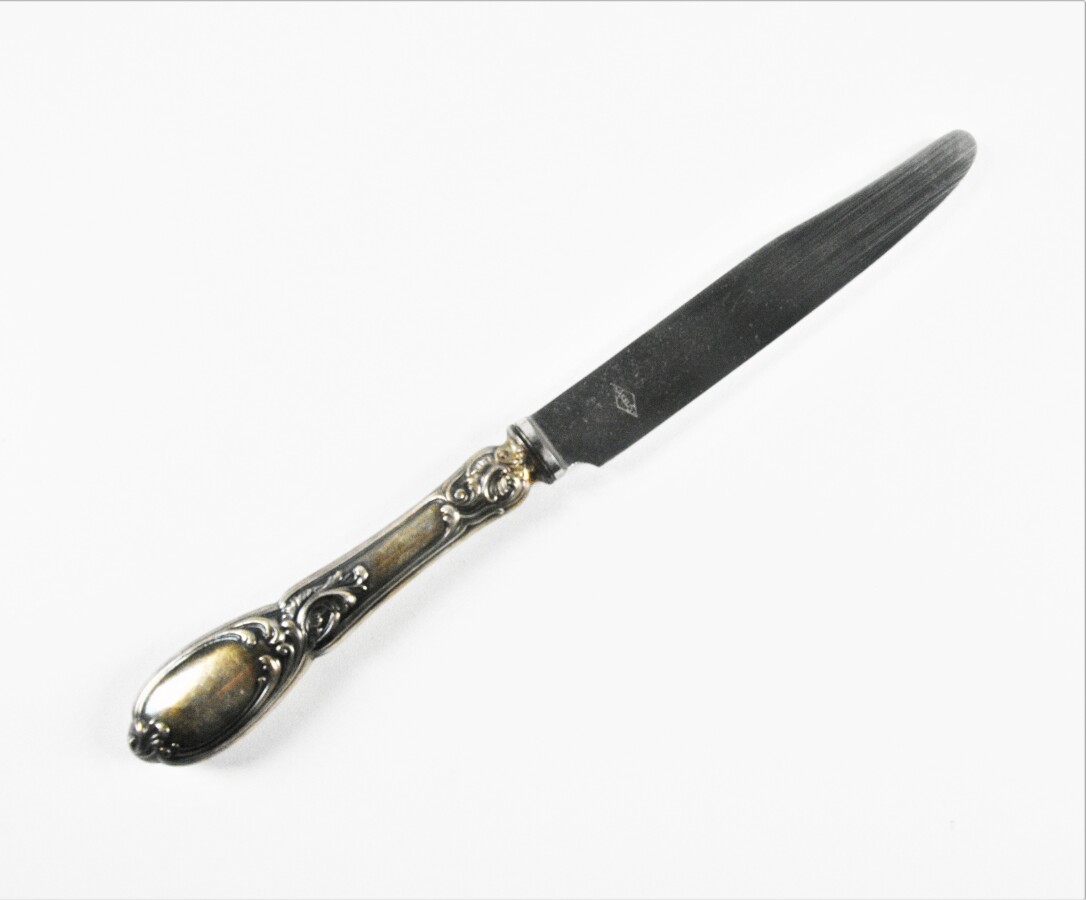Suite de douze couteaux, manche en argent fourré à décor rocaille de feuillages et d'entrelacs, L. 25.5 cm. Poids brut : 1 060 g environ.