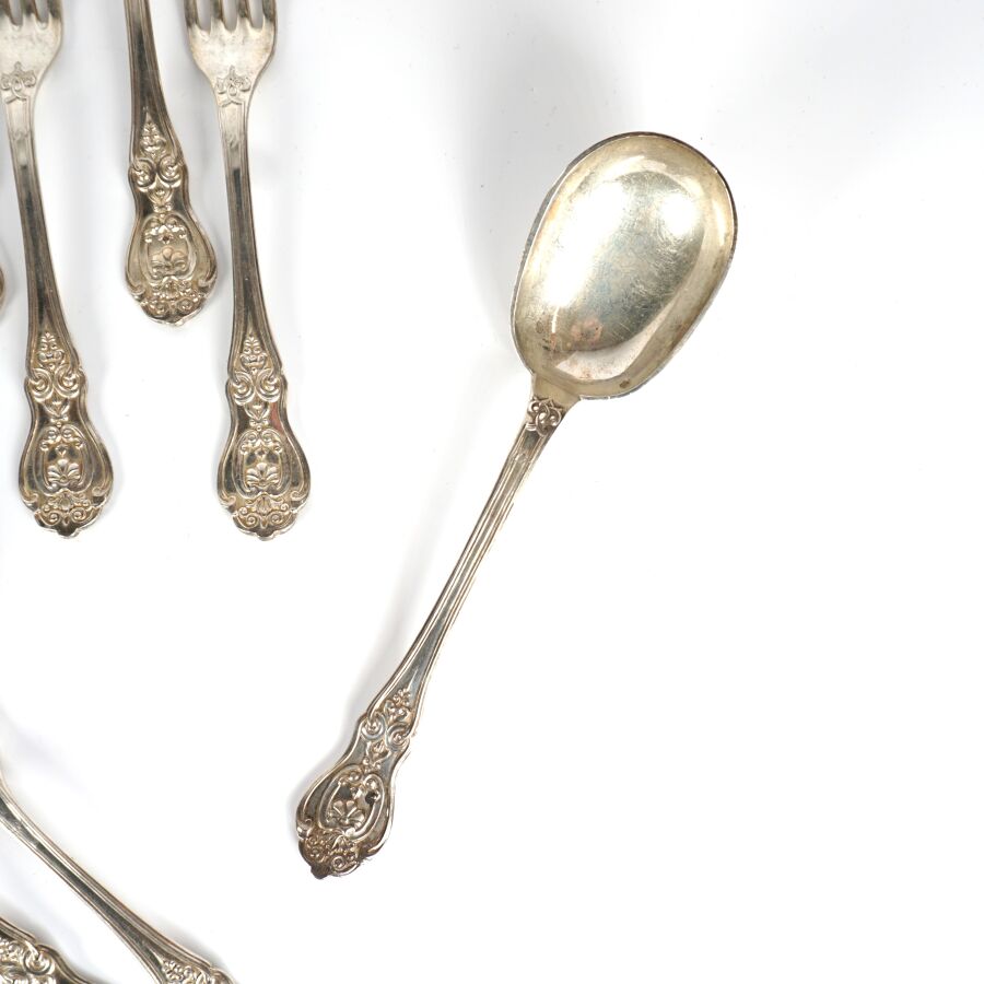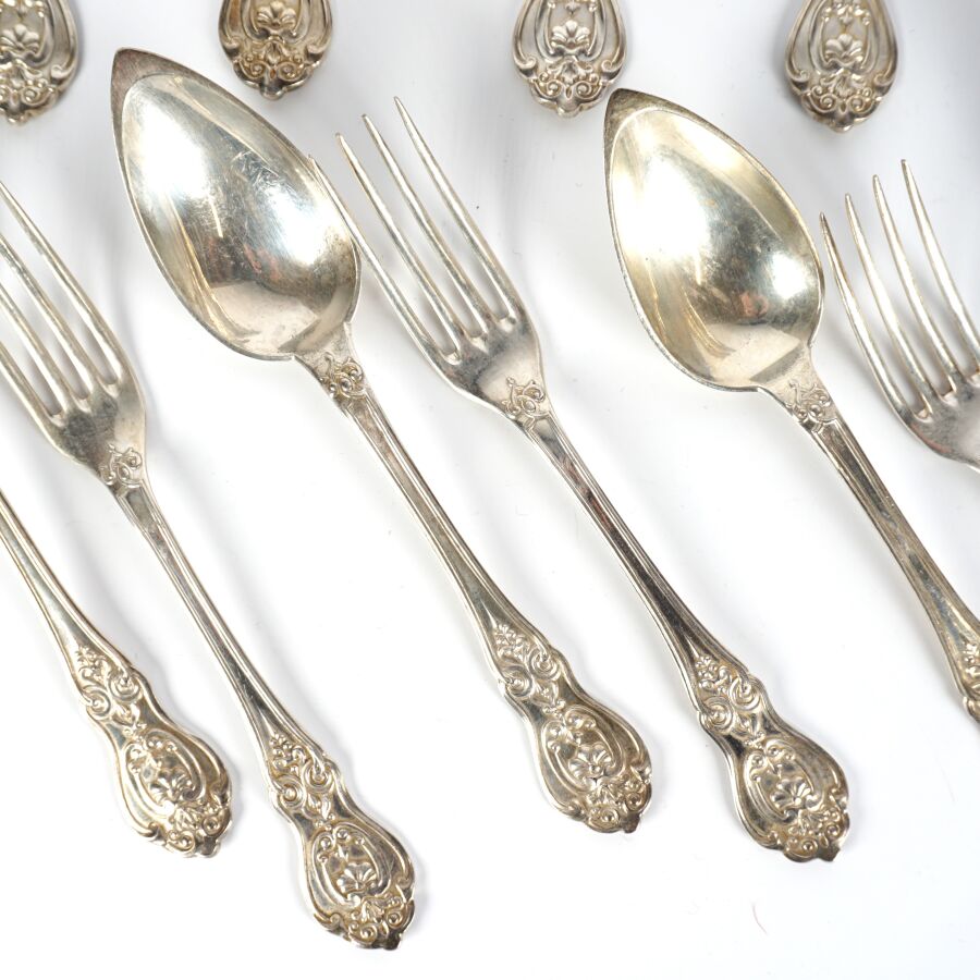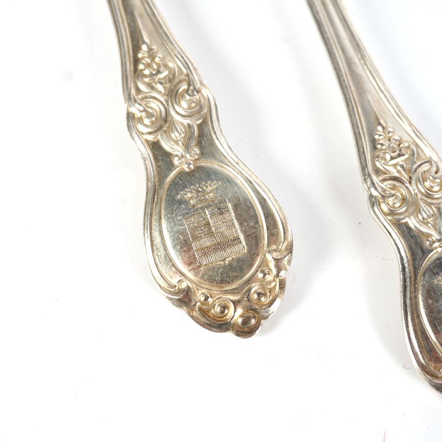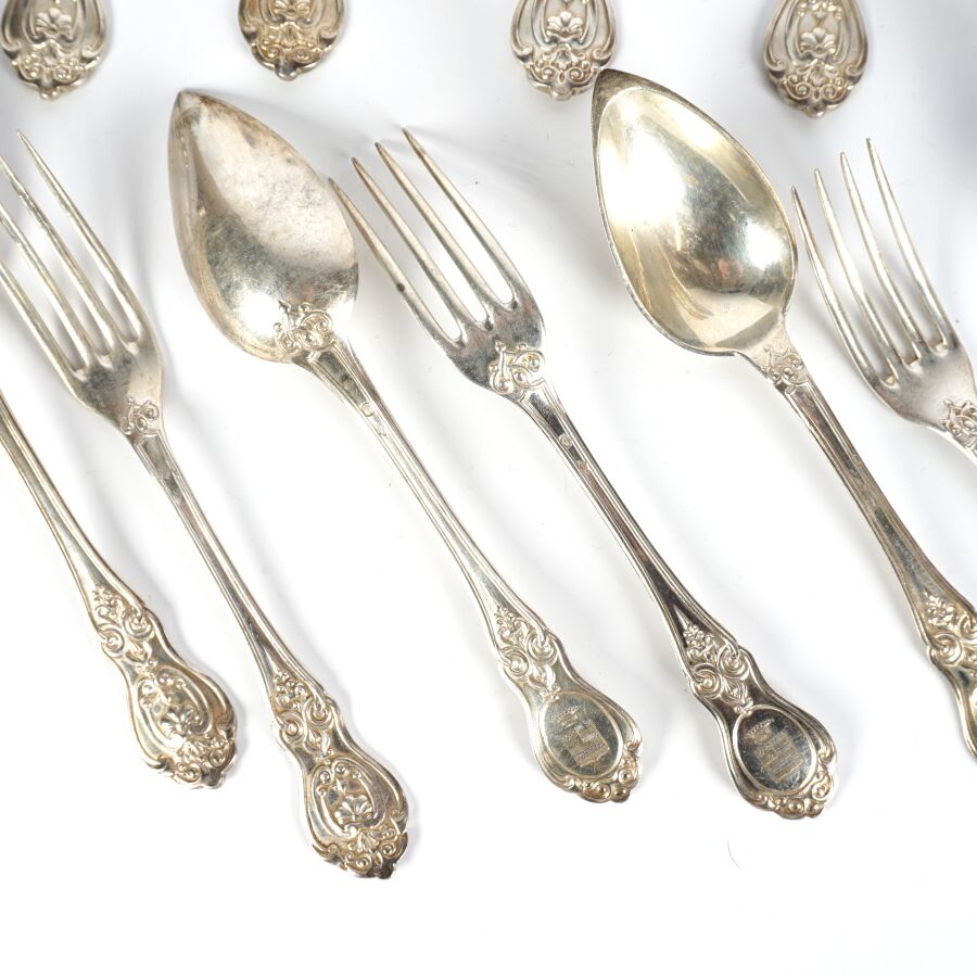 Suite de douze couverts et une cuillère de service en argent, poinçon Minerve 1er titre (950/oo), poinçon de MO "ND", le différend à motif d'une cuillère entourée d'un noeud, à décor de ferronneries, l'arrière du manche à décor gravé d'un blason surmonté d'une couronne comtale, Poids brut : 1 475 g environ.