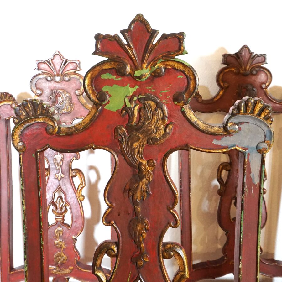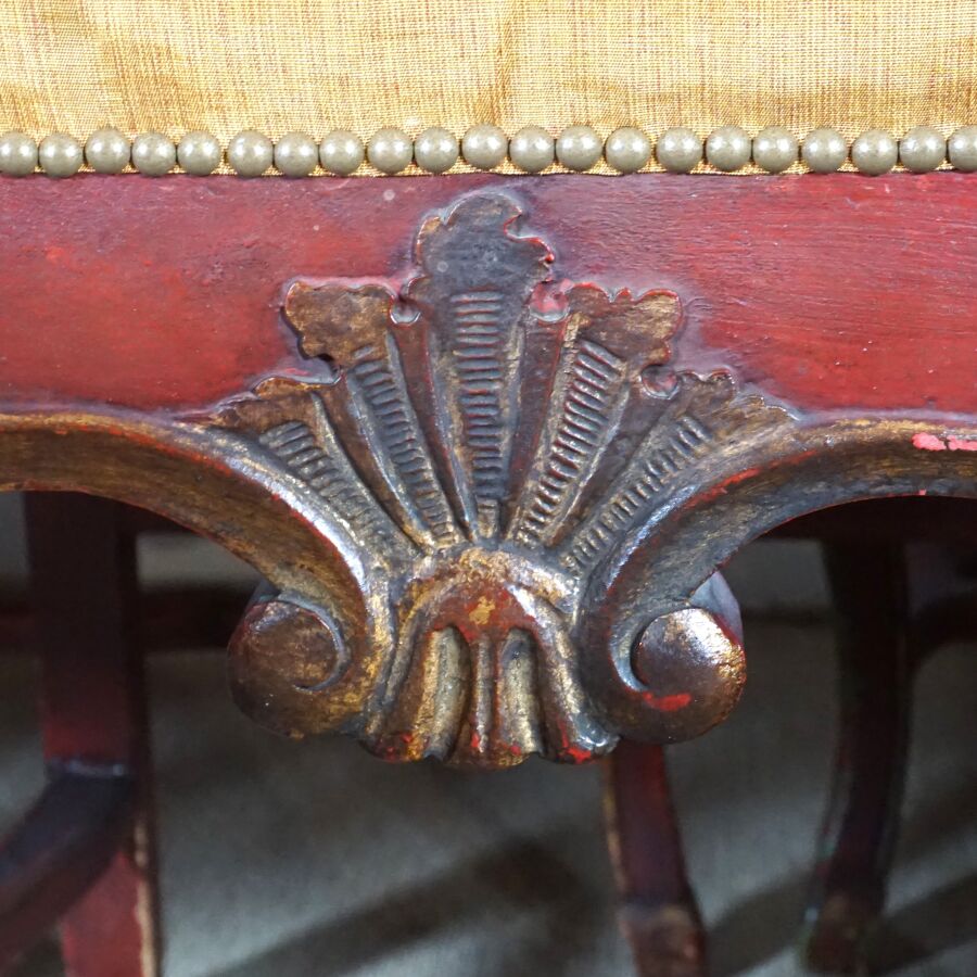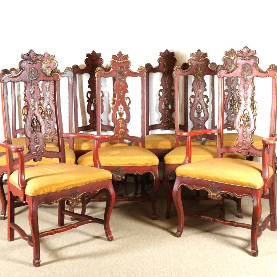 Suite de sept chaises et paire de fauteuils en bois laqué bordeaux et rehaut d'or, dossier droit ajouré à motif d'entrelacs, coquilles et volutes, accotoirs à enroulement, piétements cambrés, entretoise en H, assises garnies de tissu orange, de style Extrême-Orient, H. 125.5 cm (usures, taches, écaillures).