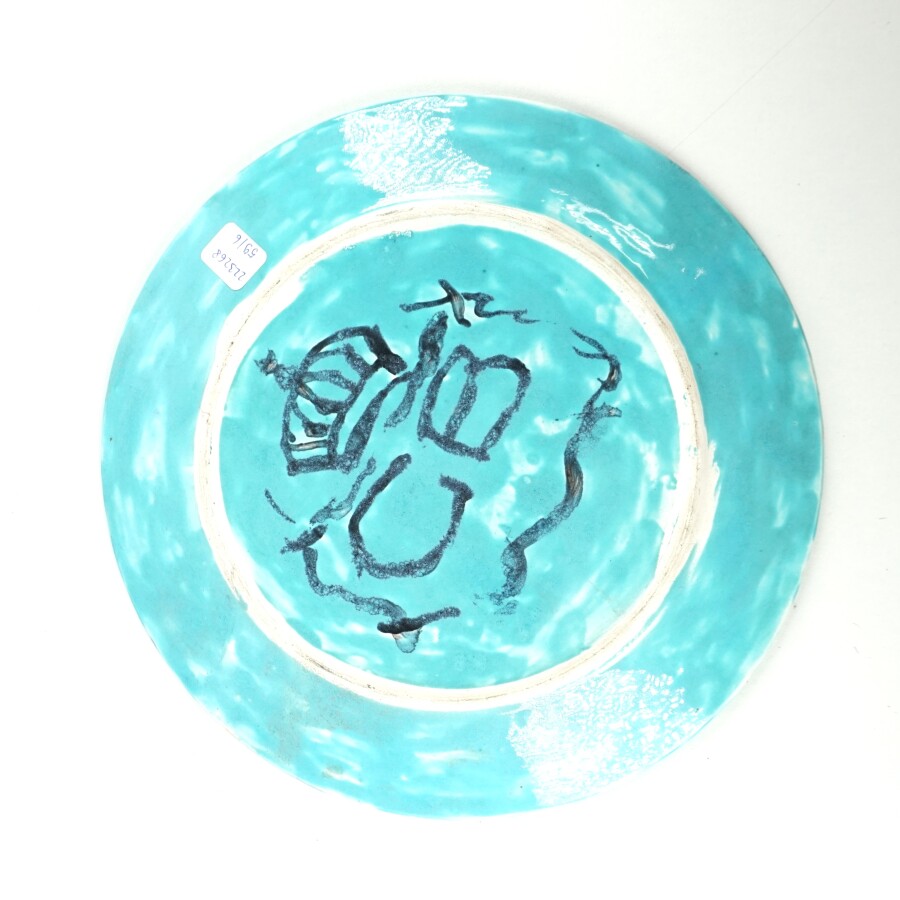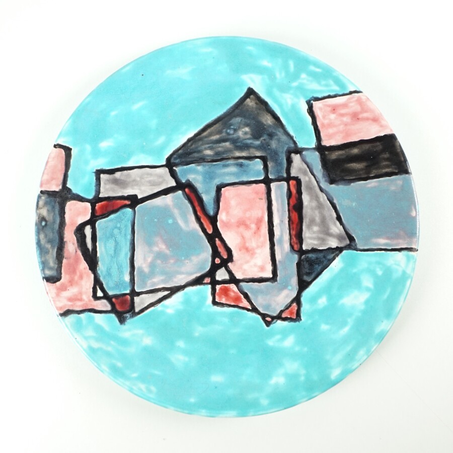 Suite de six assiettes, céramique émaillée polychrome, à décor moderniste, certaines marquées au dos C.B, Diam : 23.7 cm.