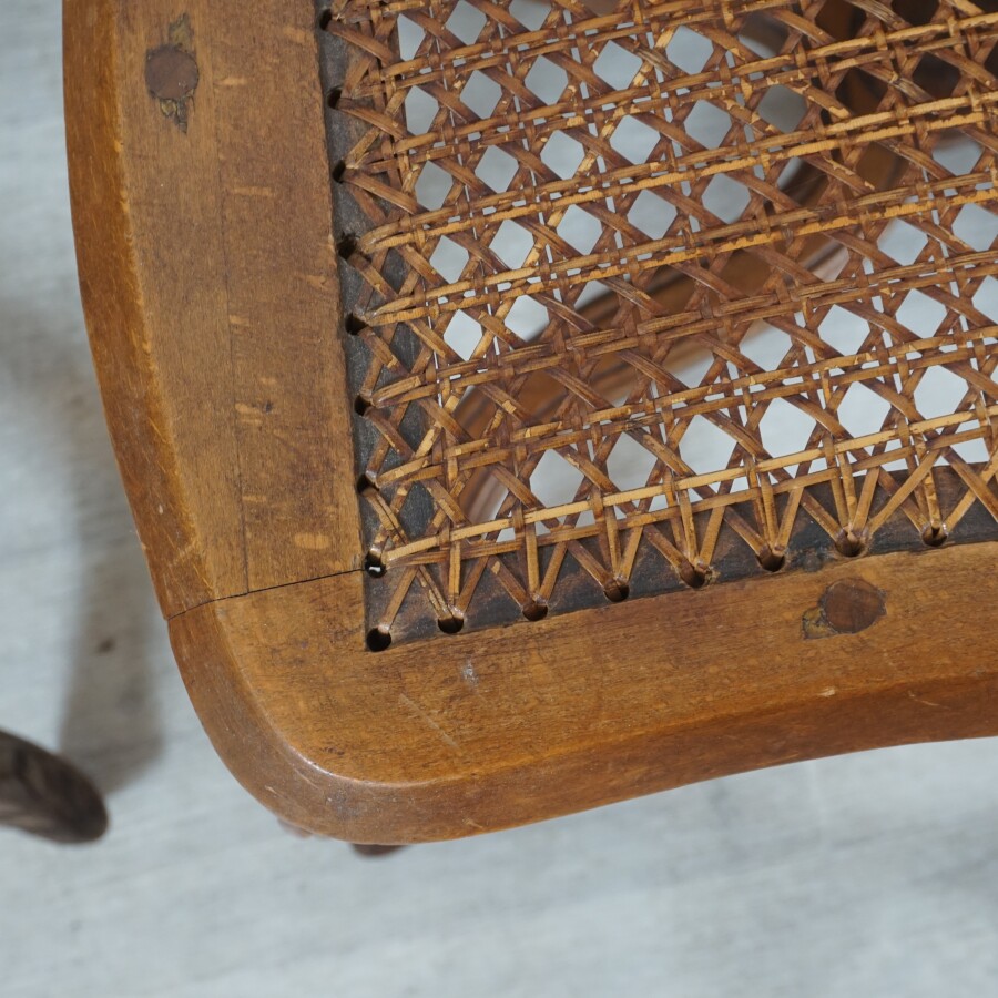 On joint une chaise du même décor, assise et dossier canné, d'époque Régence, H. 89.7 cm.