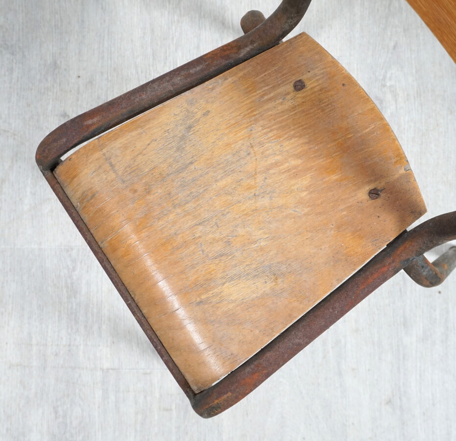 Suite de trois chaises pour enfant, structure tubulaire en métal laqué, assises et dossiers en contreplaqué (en l'état).