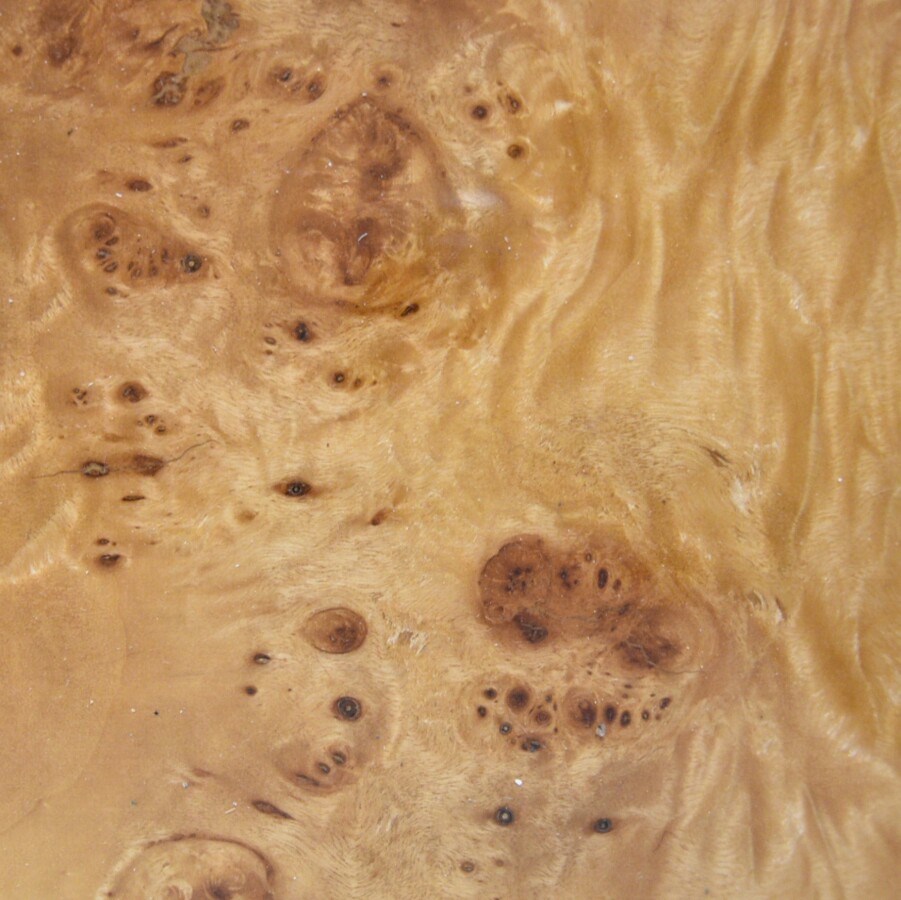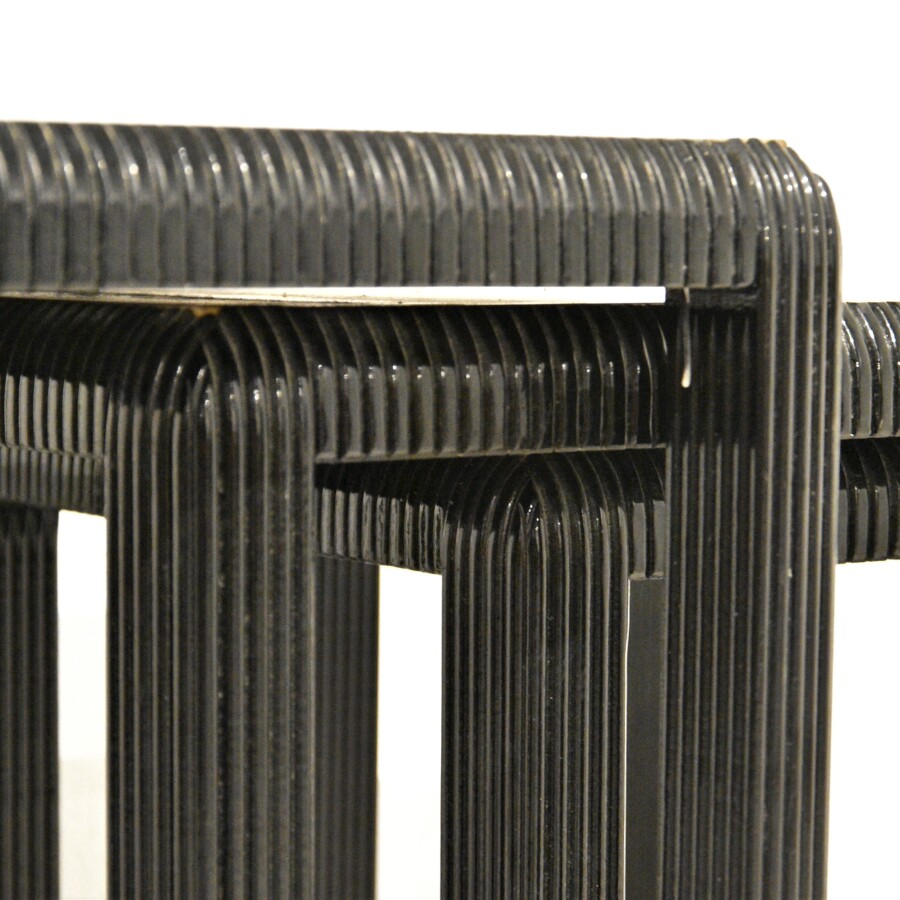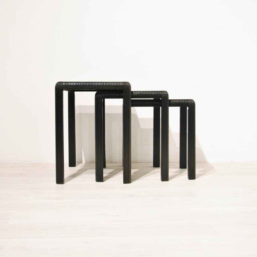 Suite de trois tables gigognes de forme carrée, piètement en bois laqué noir à motif de cannelures, le plateau à l'imitation de la loupe d'érable ?, travail moderne, H. de 42 cm à 52 cm (usures).